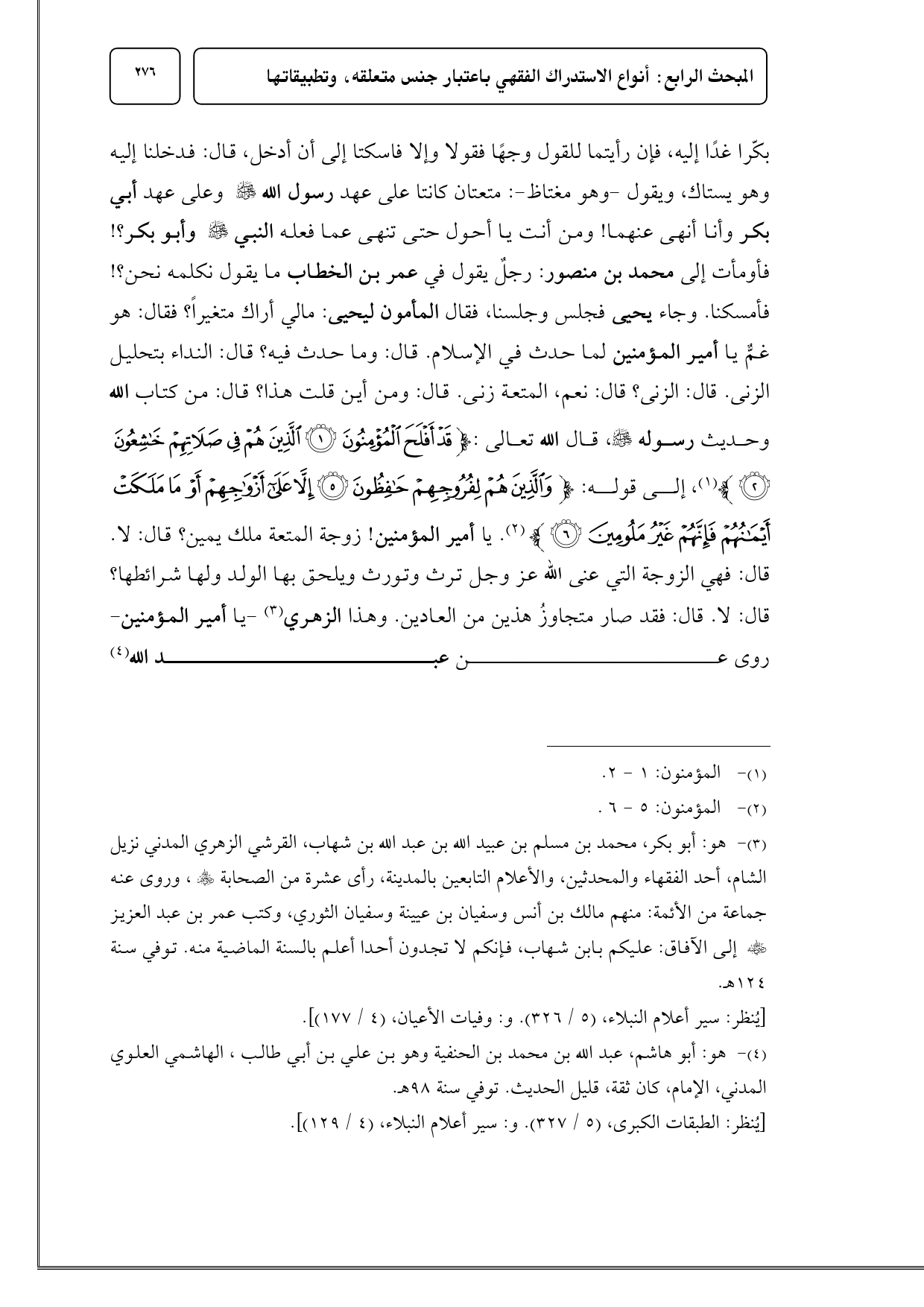 بكّرا غدًا إليه، فإن رأيتما للقول وجهًا فقولا وإلا فاسكتا إلى أن أدخل، قال: فدخلنا إليه وهو يستاك، ويقول - وهو مغتاظ -: متعتان كانتا على عهد رسول الله - صلى الله عليه وسلم - وعلى عهد أبي بكر وأنا أنهى عنهما! ومن أنت يا أحول حتى تنهى عما فعله النبي - صلى الله عليه وسلم - وأبو بكر؟ ! فأومأت إلى محمد بن منصور: رجلٌ يقول في عمر بن الخطاب ما يقول نكلمه نحن؟ ! فأمسكنا. وجاء يحيى فجلس وجلسنا، فقال المأمون ليحيى: مالي أراك متغيراً؟ فقال: هو غمٌّ يا أمير المؤمنين لما حدث في الإسلام. قال: وما حدث فيه؟ قال: النداء بتحليل الزنى. قال: الزنى؟ قال: نعم، المتعة زنى. قال: ومن أين قلت هذا؟ قال: من كتاب الله وحديث رسوله - صلى الله عليه وسلم -، قال الله تعالى: {قَدْ أَفْلَحَ الْمُؤْمِنُونَ (1) الَّذِينَ هُمْ فِي صَلَاتِهِمْ خَاشِعُونَ (2)} (¬1)، إلى قوله: {وَالَّذِينَ هُمْ لِفُرُوجِهِمْ حَافِظُونَ (5) إِلَّا عَلَى أَزْوَاجِهِمْ أَوْ مَا مَلَكَتْ أَيْمَانُهُمْ فَإِنَّهُمْ غَيْرُ مَلُومِينَ (6)} (¬2). يا أمير المؤمنين! زوجة المتعة ملك يمين؟ قال: لا. قال: فهي الزوجة التي عنى الله عز وجل ترث وتورث ويلحق بها الولد ولها شرائطها؟ قال: لا. قال: فقد صار متجاوزُ هذين من العادين. وهذا الزهري (¬3)