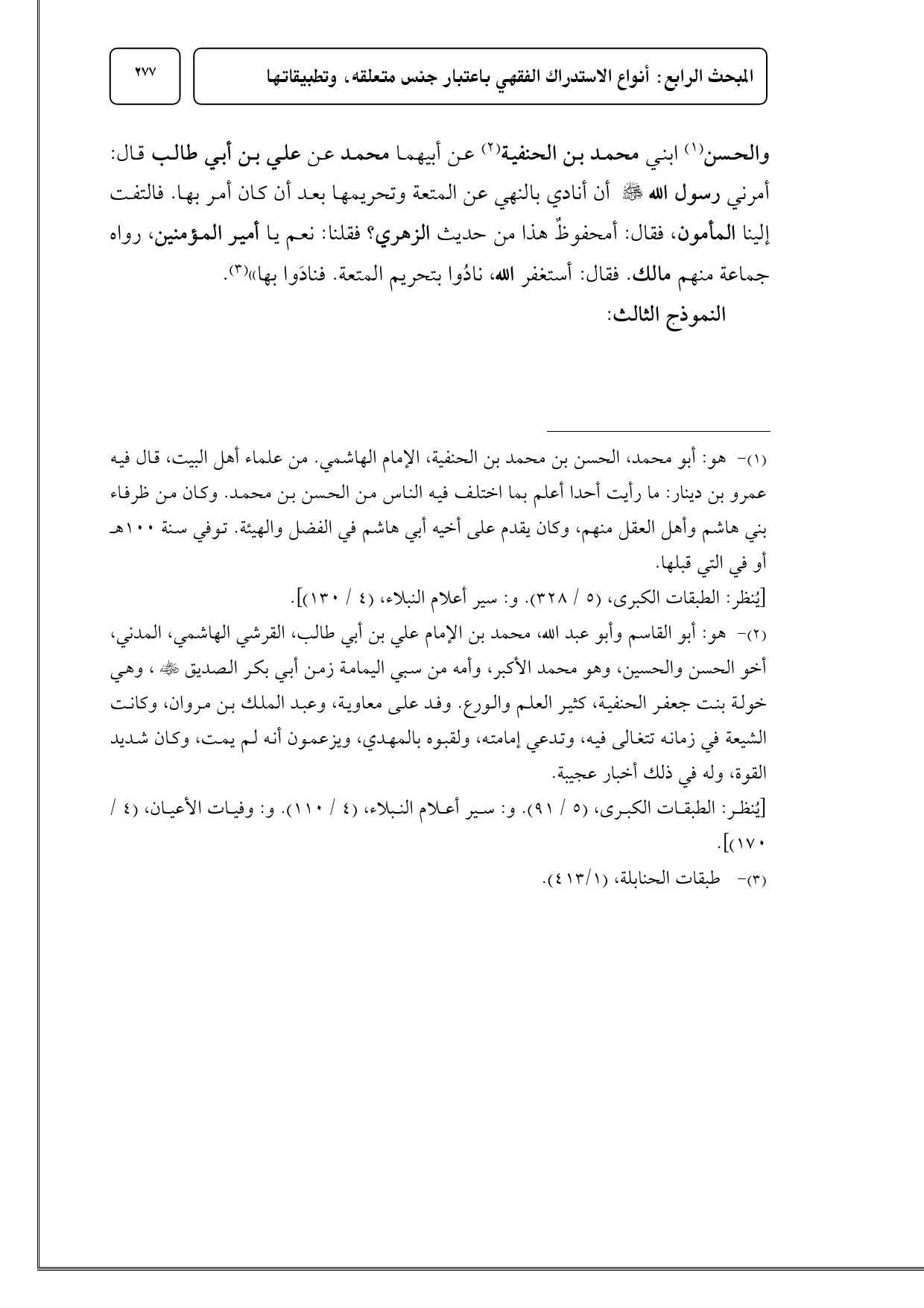 والحسن (¬1) ابني محمد بن الحنفية (¬2) عن أبيهما محمد عن علي بن أبي طالب قال: أمرني رسول الله - صلى الله عليه وسلم - أن أنادي بالنهي عن المتعة وتحريمها بعد أن كان أمر بها. فالتفت إلينا المأمون، فقال: أمحفوظٌ هذا من حديث الزهري؟ فقلنا: نعم يا أمير المؤمنين، رواه جماعة منهم مالك. فقال: أستغفر الله، نادُوا بتحريم المتعة. فنادَوا بها» (¬3).
