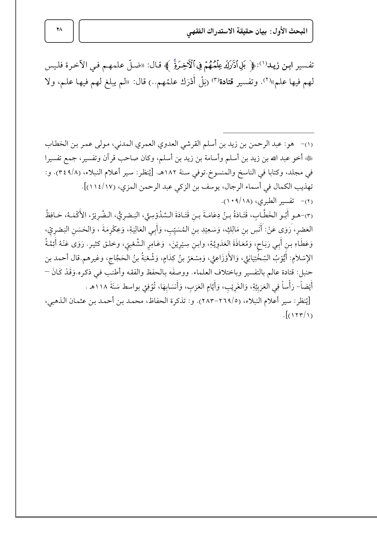 تفسير ابن زيد (¬1): {بَلِ ادَّارَكَ عِلْمُهُمْ فِي الْآخِرَةِ} قال: «ضلّ علمهم في الآخرة فليس لهم فيها علم» (¬2). وتفسير قتادة (¬3)