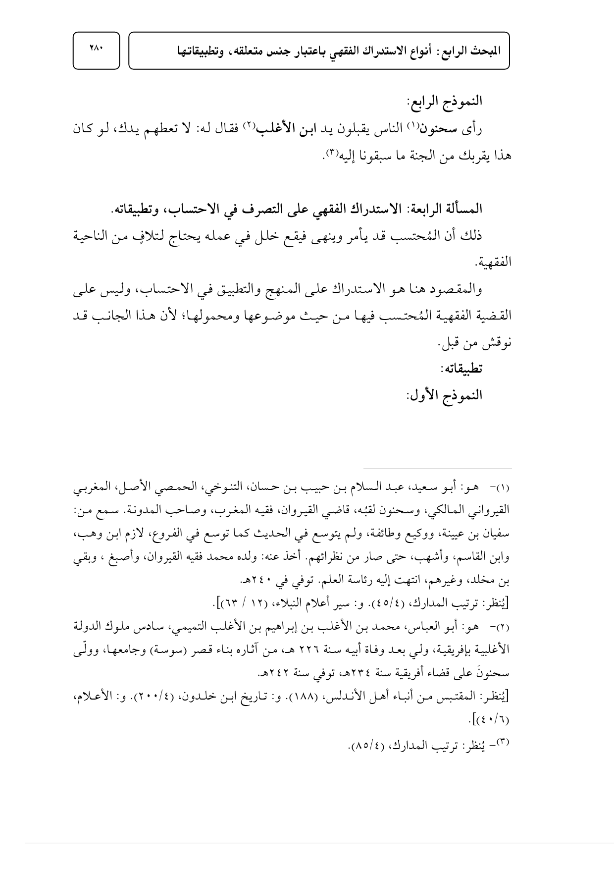 المسألة الرابعة: الاستدراك الفقهي على التصرف في الاحتساب، وتطبيقاته.