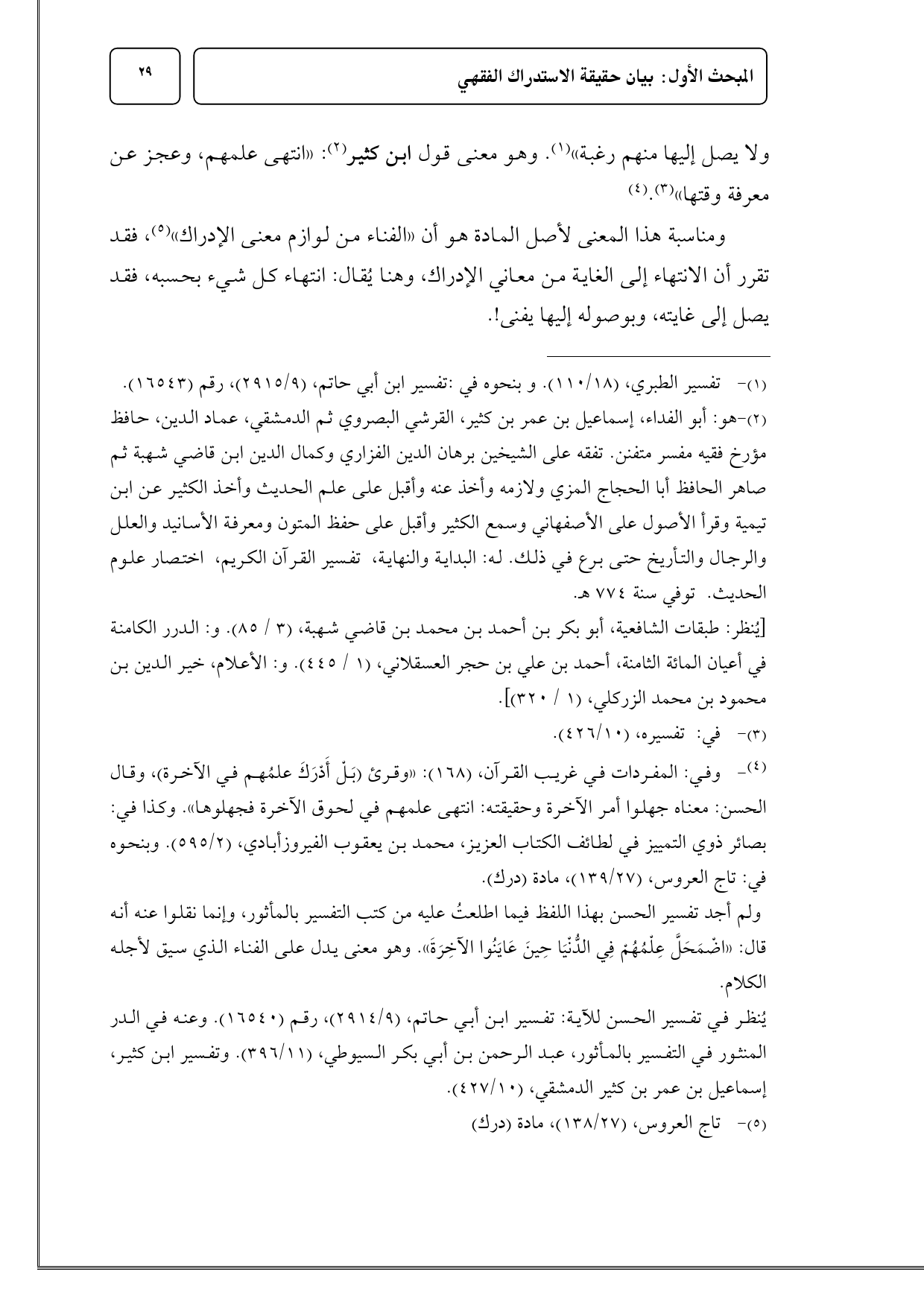 ومناسبة هذا المعنى لأصل المادة هو أن «الفناء من لوازم معنى الإدراك» (¬5)، فقد تقرر أن الانتهاء إلى الغاية من معاني الإدراك، وهنا يُقال: انتهاء كل شيء بحسبه، فقد يصل إلى غايته، وبوصوله إليها يفنى! .