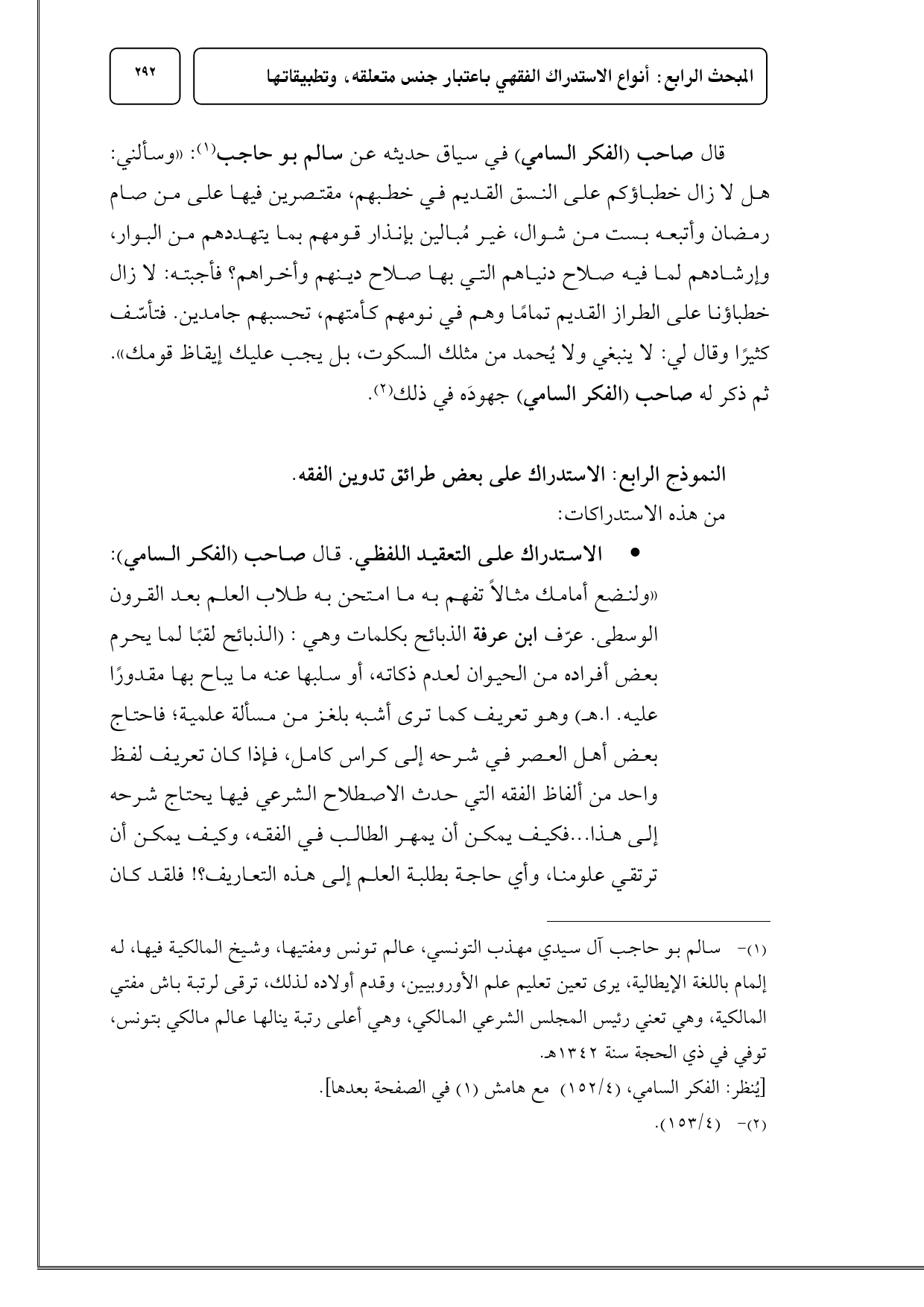 - الاستدراك على التعقيد اللفظي. قال صاحب (الفكر السامي): «ولنضع أمامك مثالاً تفهم به ما امتحن به طلاب العلم بعد القرون الوسطى. عرّف ابن عرفة الذبائح بكلمات وهي: (الذبائح لقبًا لما يحرم بعض أفراده من الحيوان لعدم ذكاته، أو سلبها عنه ما يباح بها مقدورًا عليه. ا. هـ) وهو تعريف كما ترى أشبه بلغز من مسألة علمية؛ فاحتاج بعض أهل العصر في شرحه إلى كراس كامل، فإذا كان تعريف لفظ واحد من ألفاظ الفقه التي حدث الاصطلاح الشرعي فيها يحتاج شرحه إلى هذا ... فكيف يمكن أن يمهر الطالب في الفقه، وكيف يمكن أن ترتقي علومنا، وأي حاجة بطلبة العلم إلى هذه التعاريف؟ ! فلقد كان