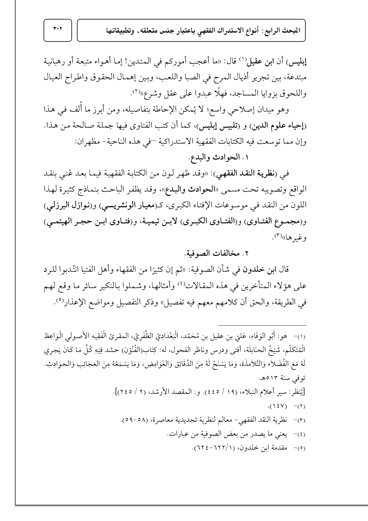 في (نظرية النقد الفقهي): «وقد ظهر لون من الكتابة الفقهية فيما بعد عُني بنقد الواقع وتصويبه تحت مسمى «الحوادث والبدع»، وقد يظفر الباحث بنماذج كثيرة لهذا اللون من النقد في موسوعات الإفتاء الكبرى، كـ (معيار الونشريسي) و (نوازل البرزلي) و (مجموع الفتاوى) و (الفتاوى الكبرى) لابن تيمية، و (فتاوى ابن حجر الهيتمي) وغيرها» (¬3).
