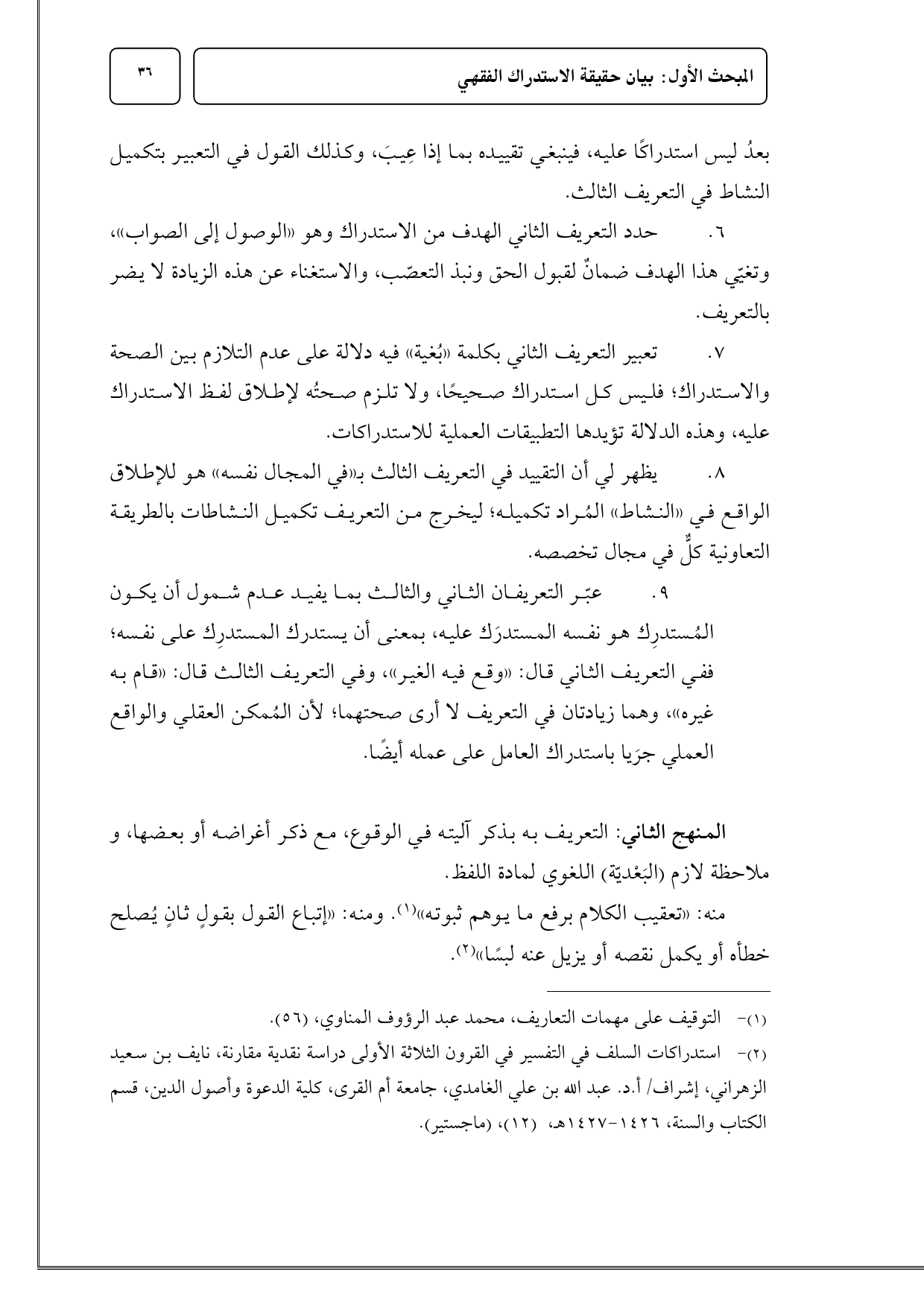 7 - تعبير التعريف الثاني بكلمة «بُغية» فيه دلالة على عدم التلازم بين الصحة والاستدراك؛ فليس كل استدراك صحيحًا، ولا تلزم صحتُه لإطلاق لفظ الاستدراك عليه، وهذه الدلالة تؤيدها التطبيقات العملية للاستدراكات.