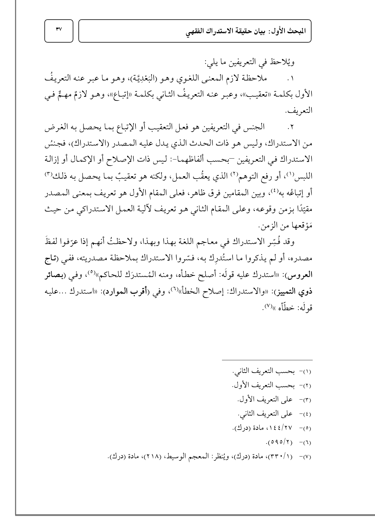 2 - الجنس في التعريفين هو فعل التعقيب أو الإتباع بما يحصل به الغرض من الاستدراك، وليس هو ذات الحدث الذي يدل عليه المصدر (الاستدراك)، فجنسُ الاستدراك في التعريفين - بحسب ألفاظهما -: ليس ذات الإصلاح أو الإكمال أو إزالة اللبس (¬1)، أو رفع التوهم (¬2) الذي يعقُب العمل، ولكنه هو تعقيبٌ بما يحصل به ذلك (¬3) أو إتباعُه به (¬4)، وبين المقامين فرق ظاهر، فعلى المقام الأول هو تعريف