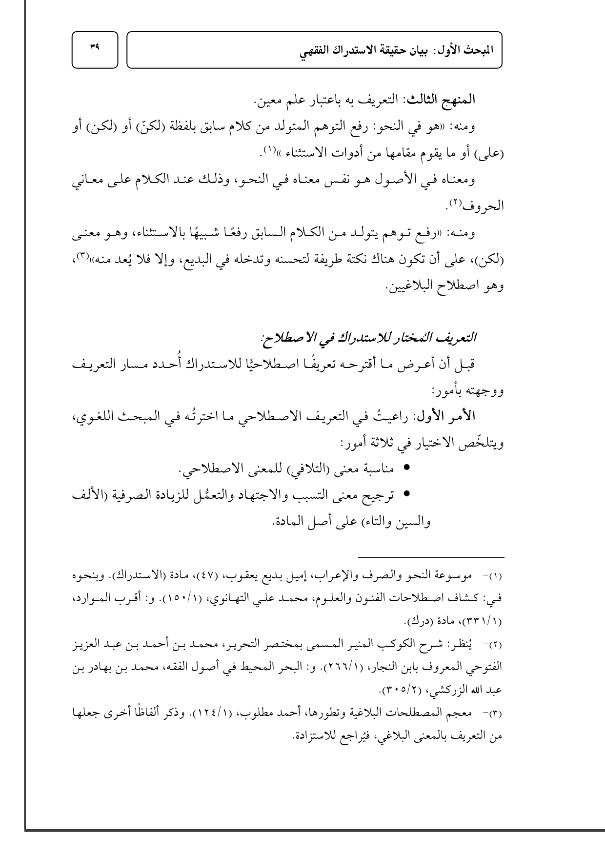 قبل أن أعرض ما أقترحه تعريفًا اصطلاحيًّا للاستدراك أُحدد مسار التعريف ووجهته بأمور: