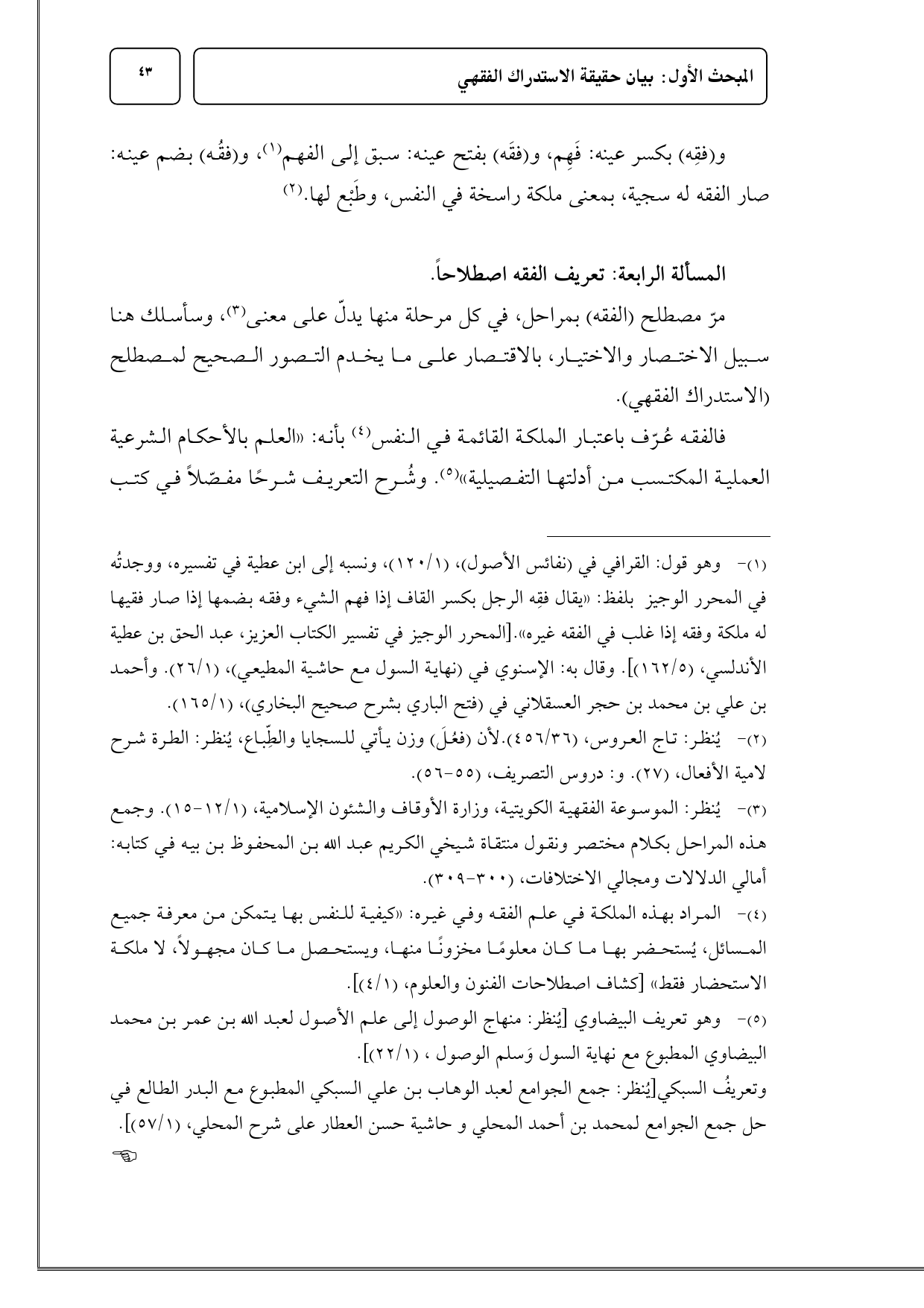 (¬4) المراد بهذه الملكة في علم الفقه وفي غيره: «كيفية للنفس بها يتمكن من معرفة جميع المسائل، يُستحضر بها ما كان معلومًا مخزونًا منها، ويستحصل ما كان مجهولاً، لا ملكة الاستحضار فقط» [كشاف اصطلاحات الفنون والعلوم، (1/ 4)].