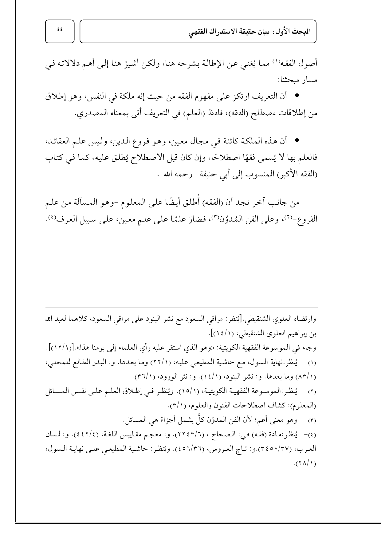 (¬4) يُنظر: مادة (فقه) في: الصحاح، (6/ 2243). و: معجم مقاييس اللغة، (4/ 442). و: لسان العرب، (37/ 3450). و: تاج العروس، (36/ 456). ويُنظر: حاشية المطيعي على نهاية السول، (1/ 28).
