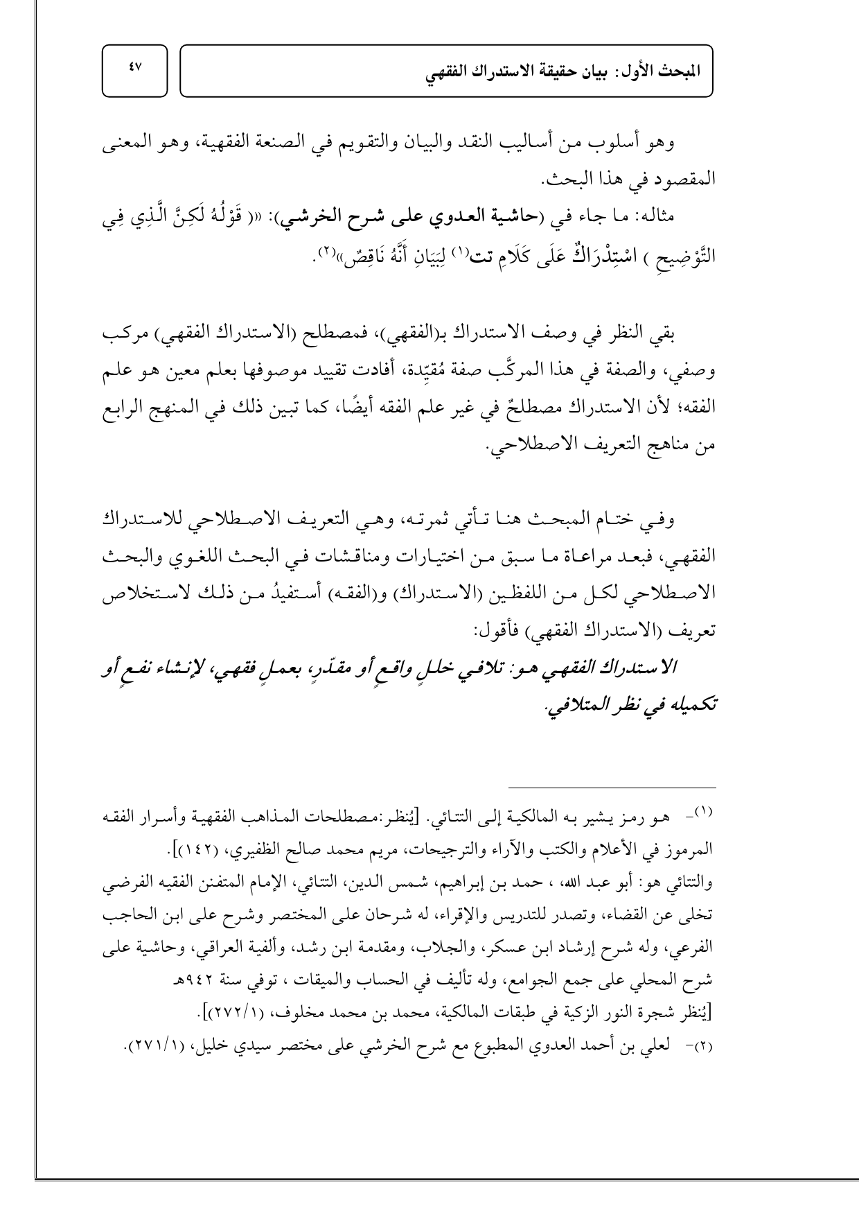 مثاله: ما جاء في (حاشية العدوي على شرح الخرشي): «(قَوْلُهُ لَكِنَّ الَّذِي فِي التَّوْضِيحِ) اسْتِدْرَاكٌ عَلَى كَلَامِ تت (¬1) لِبَيَانِ أَنَّهُ نَاقِصٌ» (¬2).