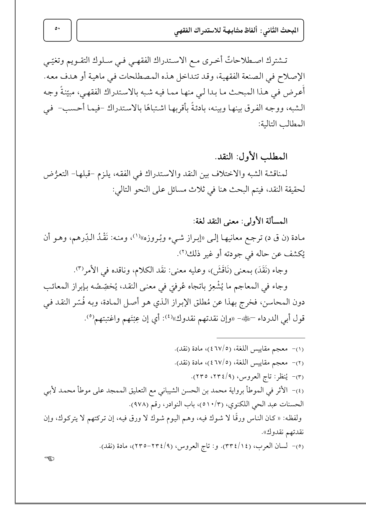 لمناقشة الشبه والاختلاف بين النقد والاستدراك في الفقه، يلزم - قبلها - التعرُّض لحقيقة النقد، فيتم البحث هنا في ثلاث مسائل على النحو التالي: