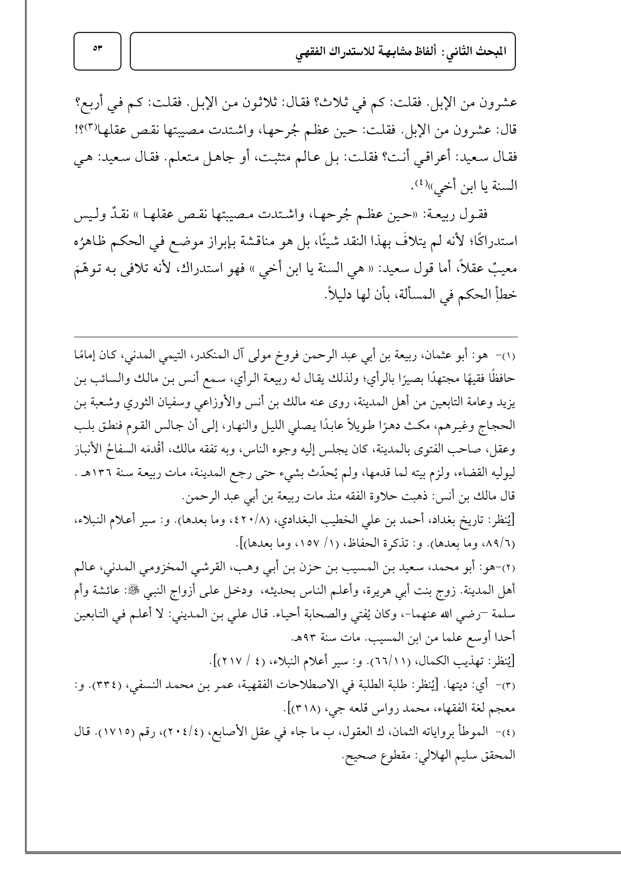 فقول ربيعة: «حين عظم جُرحها، واشتدت مصيبتها نقص عقلها» نقدٌ وليس استدراكًا؛ لأنه لم يتلافَ بهذا النقد شيئًا، بل هو مناقشة بإبراز موضع في الحكم ظاهرُه معيبٌ عقلاً، أما قول سعيد: «هي السنة يا ابن أخي» فهو استدراك، لأنه تلافى به توهّمَ خطأِ الحكم في المسألة، بأن لها دليلاً.