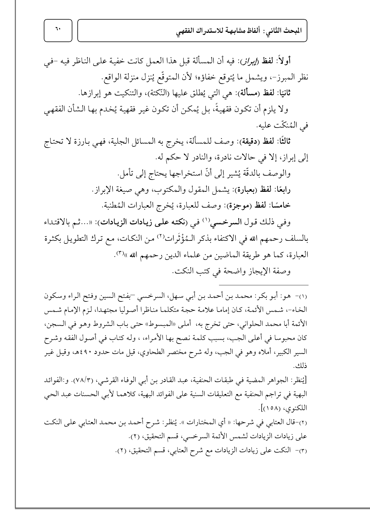 وفي ذلك قول السرخسي (¬1) في (نكته على زيادات الزيادات): « ... ثم بالاقتداء بالسلف رحمهم الله في الاكتفاء بذكر المُؤْثَرات (¬2) من النكات، مع ترك التطويل بكثرة العبارة، كما هو طريقة الماضين من علماء الدين رحمهم الله» (¬3).
