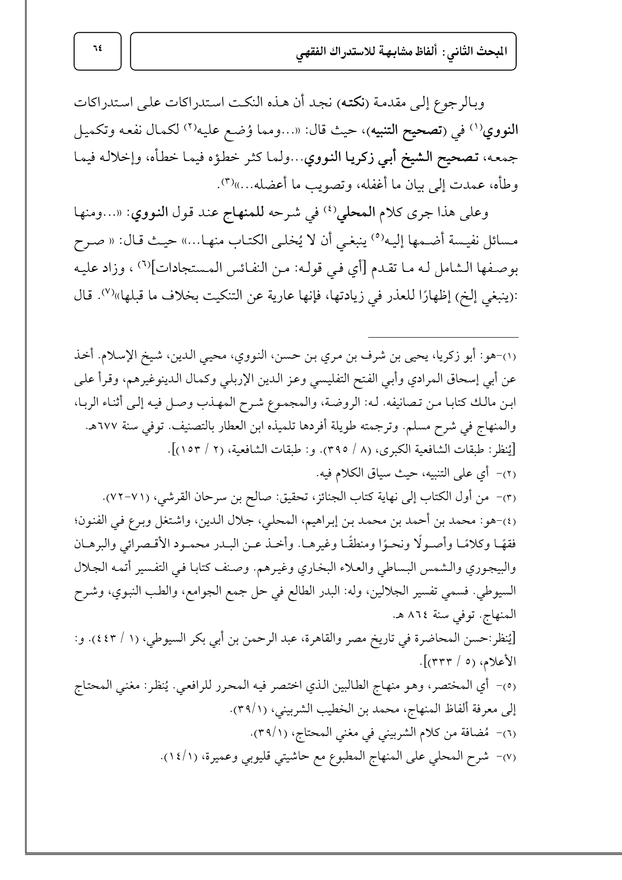 وبالرجوع إلى مقدمة (نكته) نجد أن هذه النكت استدراكات على استدراكات النووي (¬1) في (تصحيح التنبيه)، حيث قال: « ... ومما وُضع عليه (¬2) لكمال نفعه وتكميل جمعه، تصحيح الشيخ أبي زكريا النووي ... ولما كثر خطؤه فيما خطأه، وإخلاله فيما وطأه، عمدت إلى بيان ما أغفله، وتصويب ما أعضله ... » (¬3).