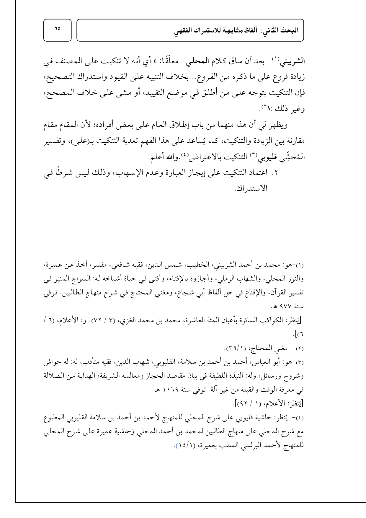ويظهر لي أن هذا منهما من باب إطلاق العام على بعض أفراده؛ لأن المقام مقام مقارنة بين الزيادة والتنكيت، كما يُساعد على هذا الفهم تعدية التنكيت بـ (على)، وتفسير المُحشِّي قليوبي (¬3) التنكيت بالاعتراض (¬4). والله أعلم