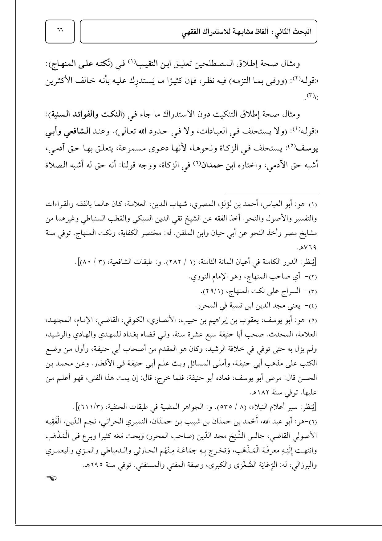 ومثال صحة إطلاق المصطلحين تعليق ابن النقيب (¬1) في (نُكته على المنهاج): «قوله (¬2): (ووفى بما التزمه) فيه نظر، فإن كثيرًا ما يَستدرِك عليه بأنه خالف الأكثرين» (¬3).