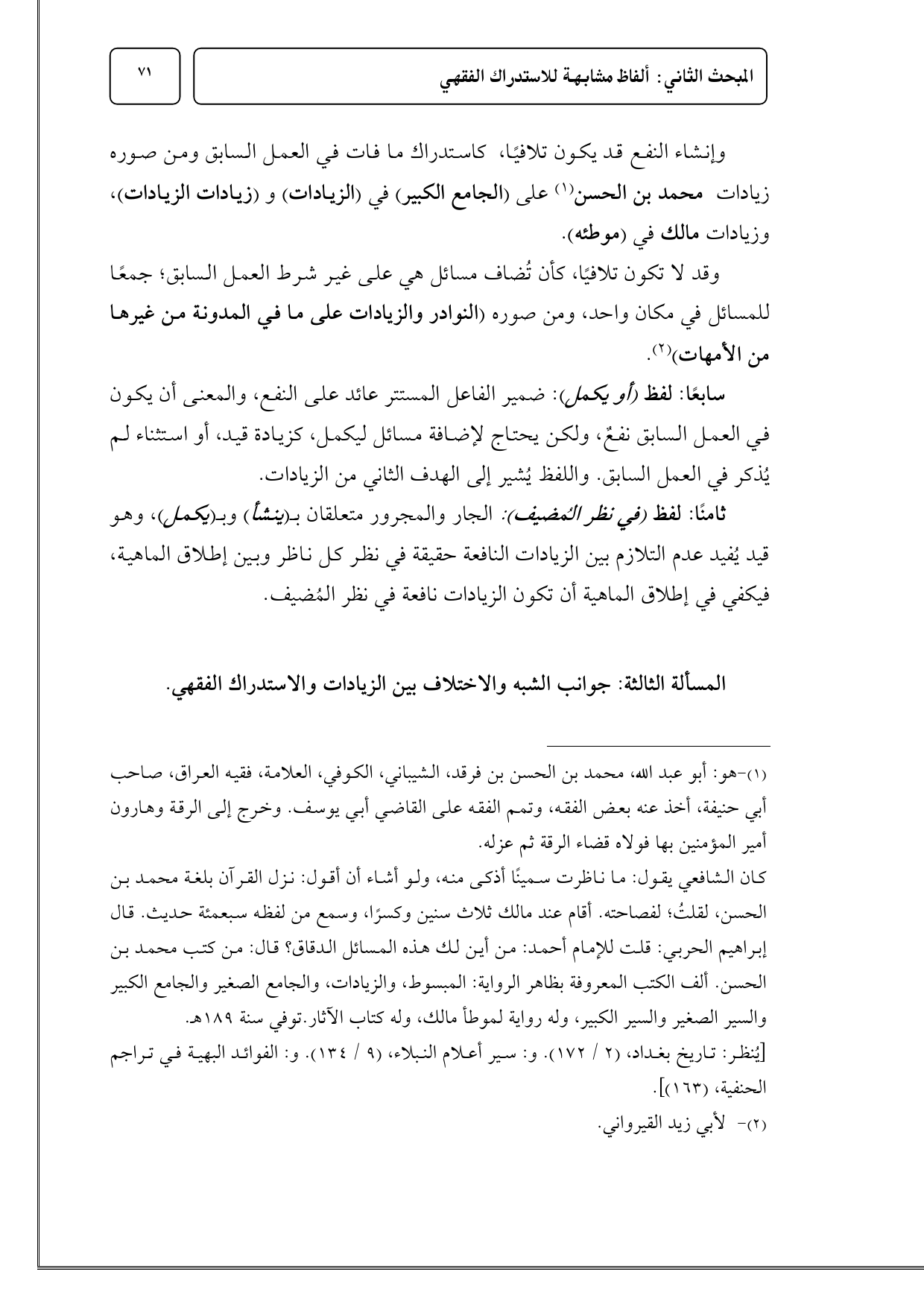 وإنشاء النفع قد يكون تلافيًا، كاستدراك ما فات في العمل السابق ومن صوره زيادات محمد بن الحسن (¬1) على (الجامع الكبير) في (الزيادات) و (زيادات الزيادات)، وزيادات مالك في (موطئه).