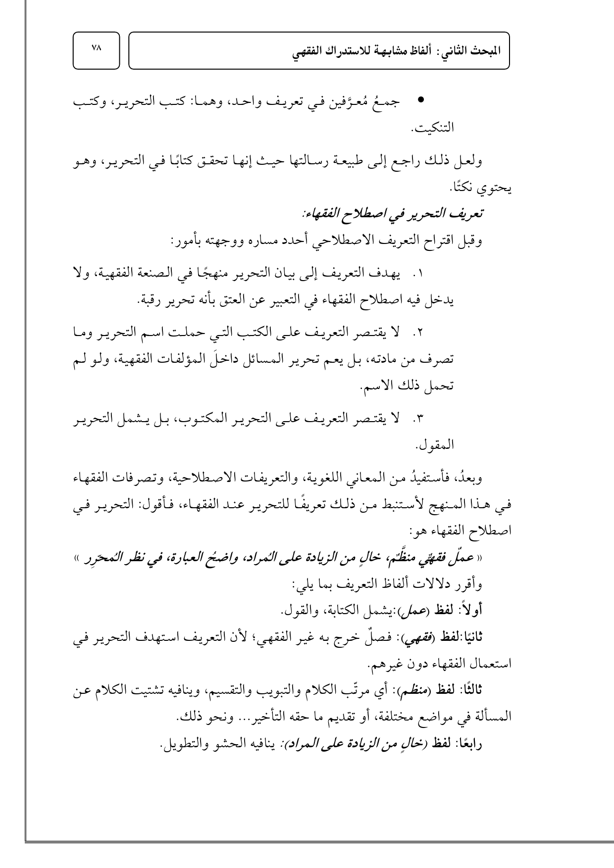 ثانيًا: لفظ (فقهي): فصلٌ خرج به غير الفقهي؛ لأن التعريف استهدف التحرير في استعمال الفقهاء دون غيرهم.