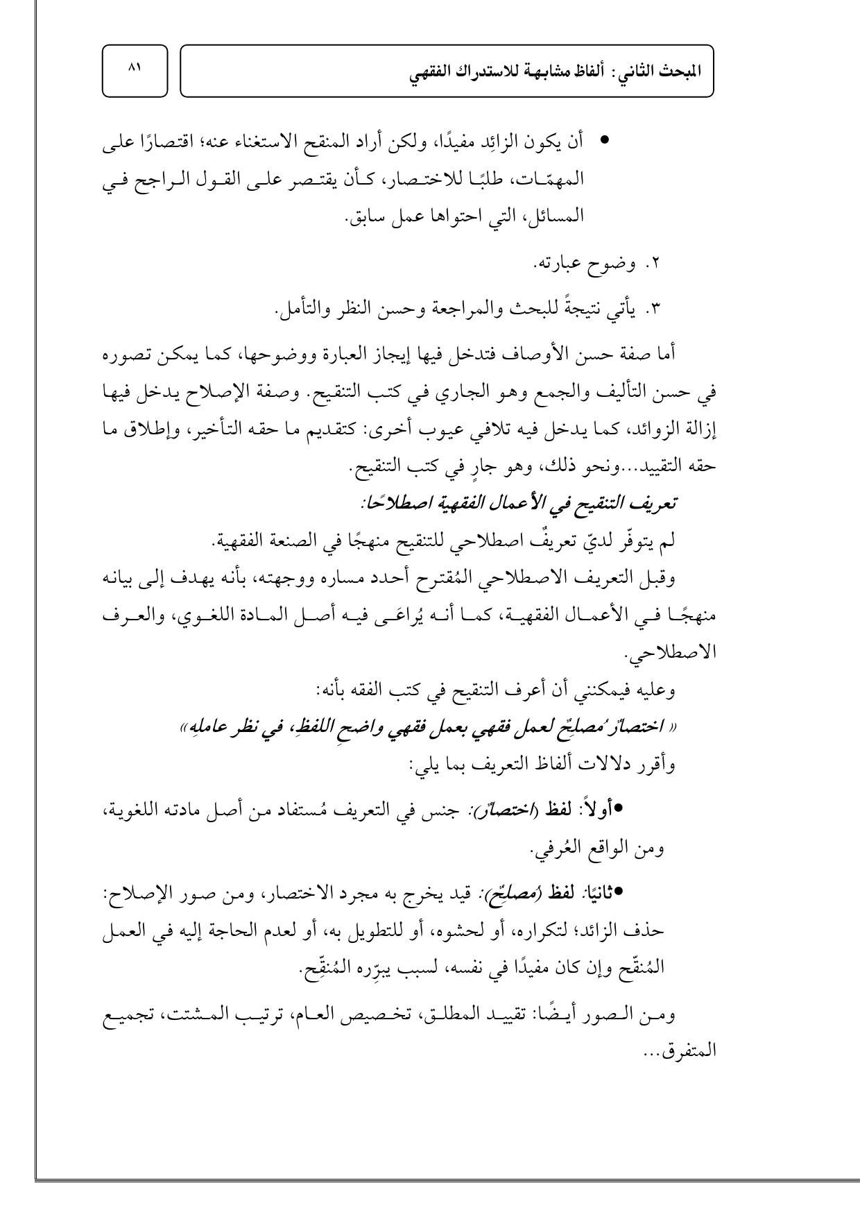 أما صفة حسن الأوصاف فتدخل فيها إيجاز العبارة ووضوحها، كما يمكن تصوره في حسن التأليف والجمع وهو الجاري في كتب التنقيح. وصفة الإصلاح يدخل فيها إزالة الزوائد، كما يدخل فيه تلافي عيوب أخرى: كتقديم ما حقه التأخير، وإطلاق ما حقه التقييد ... ونحو ذلك، وهو جارٍ في كتب التنقيح.