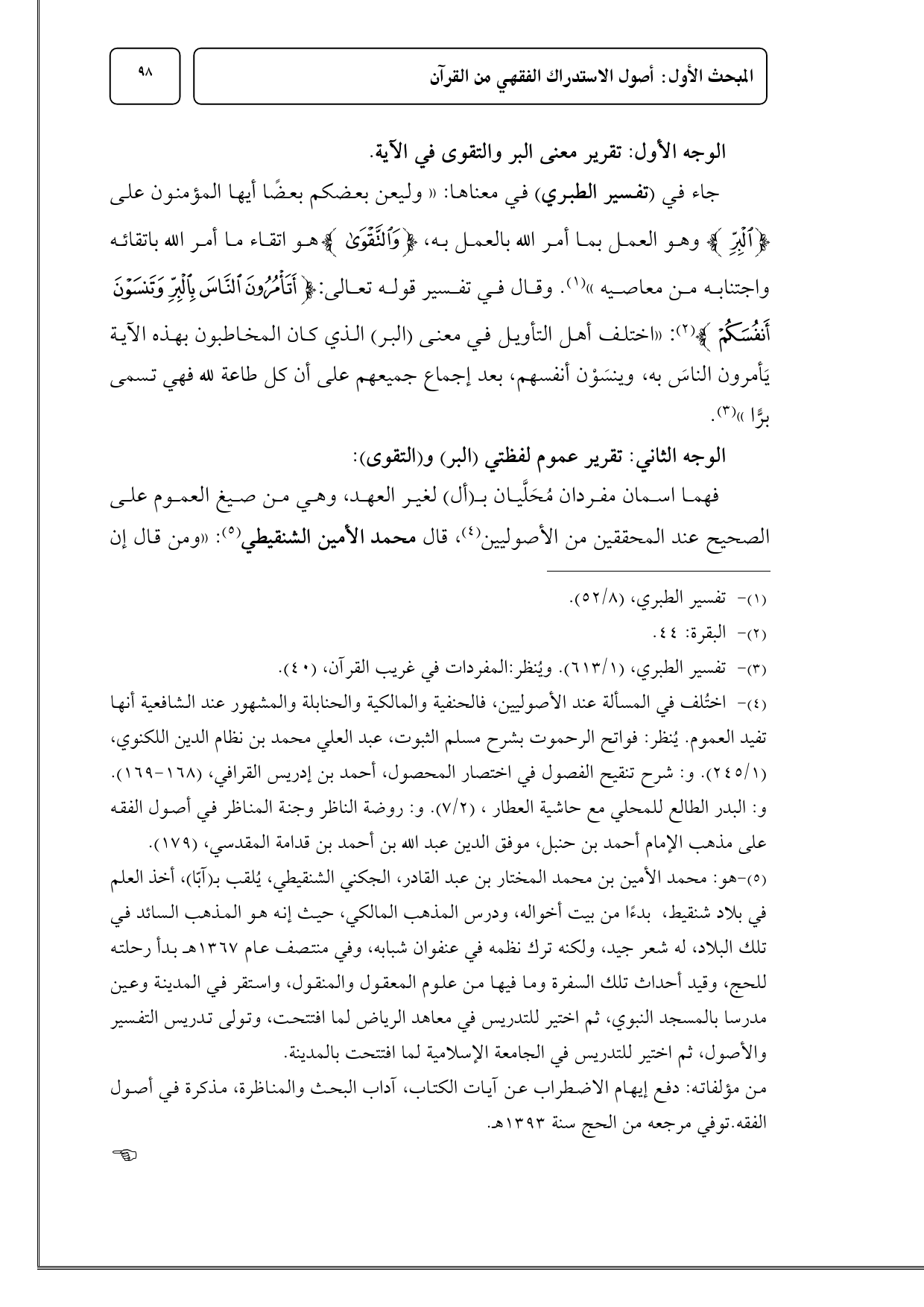 (¬5) هو: محمد الأمين بن محمد المختار بن عبد القادر، الجكني الشنقيطي، يُلقب بـ (آبّا)، أخذ العلم في بلاد شنقيط، بدءًا من بيت أخواله، ودرس المذهب المالكي، حيث إنه هو المذهب السائد في تلك البلاد، له شعر جيد، ولكنه ترك نظمه في عنفوان شبابه، وفي منتصف عام 1367 هـ بدأ رحلته للحج، وقيد أحداث تلك السفرة وما فيها من علوم المعقول والمنقول، واستقر في المدينة وعين مدرسا بالمسجد النبوي، ثم اختير للتدريس في معاهد الرياض لما افتتحت، وتولى تدريس التفسير والأصول، ثم اختير للتدريس في الجامعة الإسلامية لما افتتحت بالمدينة.