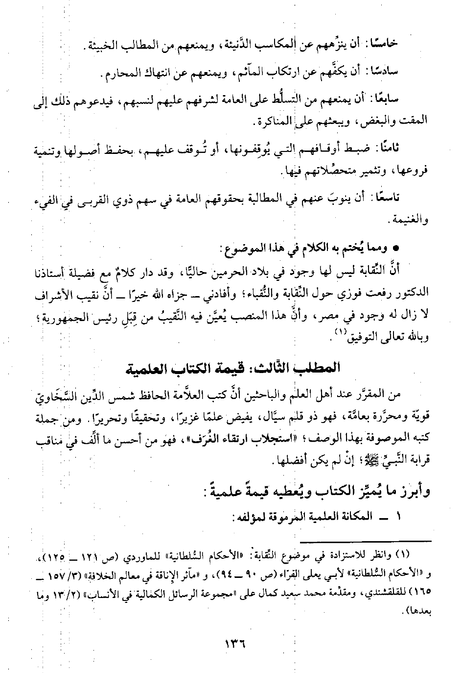 (¬١) وانظر للاستزادة في موضوع النِّقابة: "الأحكام السُّلطانية" للماوردي (ص ١٢١ - ١٢٥)، و"الأحكام السلطانية"، لأبي يعلى الفرّاء (ص ٩٠ - ٩٤)، و"مآثر الإناقة في معالم الخلافة" (٣/ ١٥٧ - ١٦٥) للقلقشندي، ومقدِّمة محمد سعيد كمال على "مجموعة الرسائل الكمالية في الأنساب" (٢/ ١٣ وما بعدها).