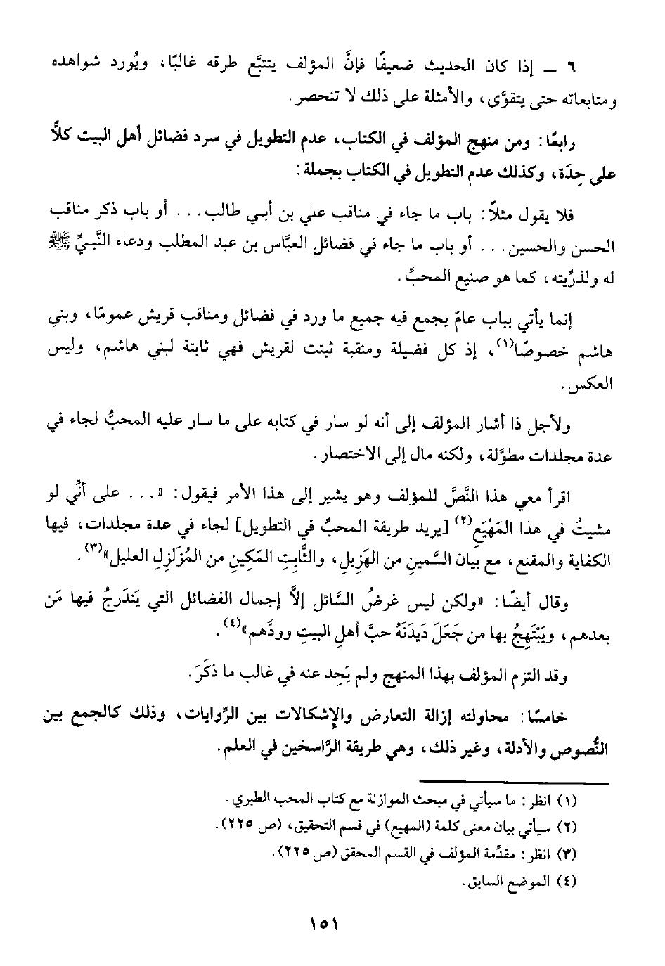 رابعًا: ومن منهج المؤلف في الكتاب، عدم التطويل في سرد فضائل أهل البيت كلًّا على حِدَة، وكذلك عدم التطويل في الكتاب بجملة: