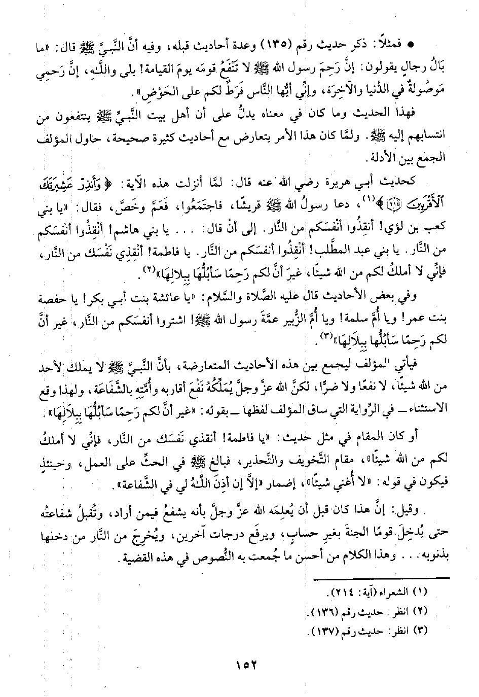 • فمثلًا: ذكر حديث رقم (١٣٥) وعدة أحاديث قبله، وفيه أنَّ النَّبيَّ -صلى الله عليه وسلم- فال: "ما بَالُ رجالٍ يقولون: إنَّ رَحِمَ رسول الله -صلى الله عليه وسلم- لا تَنْفَعُ قومَه يومَ القيامة! بلى واللَّهِ، إنَّ رَحمِي مَوصُولةٌ في الدُّنيا والآخِرَة، وإنِّي أيُّها النَّاس فَرَطٌ لكم على الحَوْضِ".