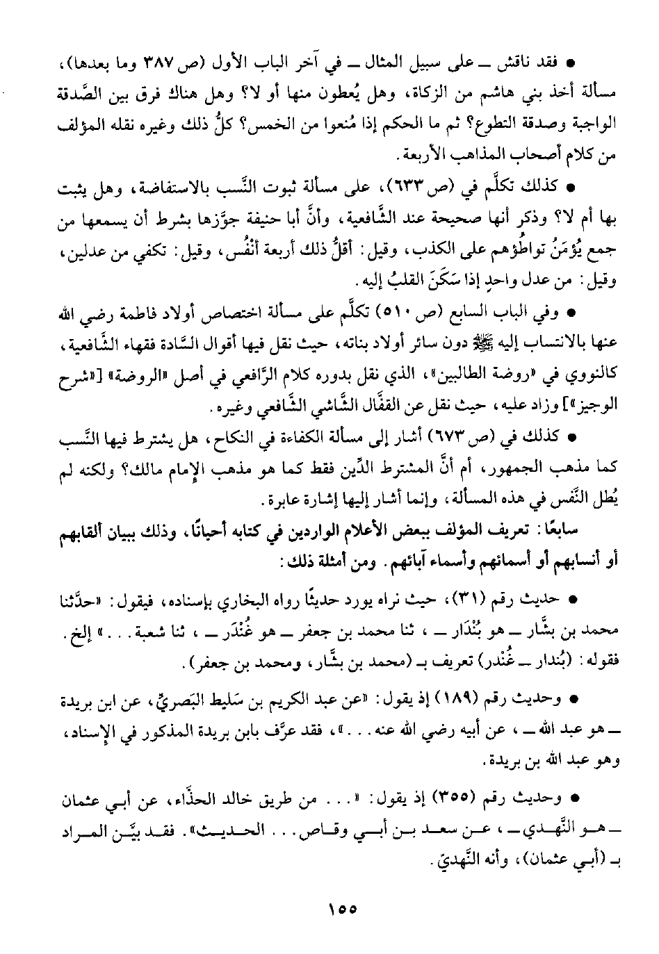 • وفي الباب السابع (ص ٥١٠) تكلَّم على مسألة اختصاص أولاد فاطمة رضي الله عنها بالانتساب إليه -صلى الله عليه وسلم- دون سائر أولاد بناته، حيث نقل فيها أقوال السَّادة فقهاء الشَّافعية، كالنووي في "روضة الطالبين"، الذي نقل بدوره كلام الرَّافعي في أصل "الروضة" ["شرح الوجيز"] وزاد عليه، حيث نقل عن القفَّال الشَّاشي الشَّافعي وغيره.