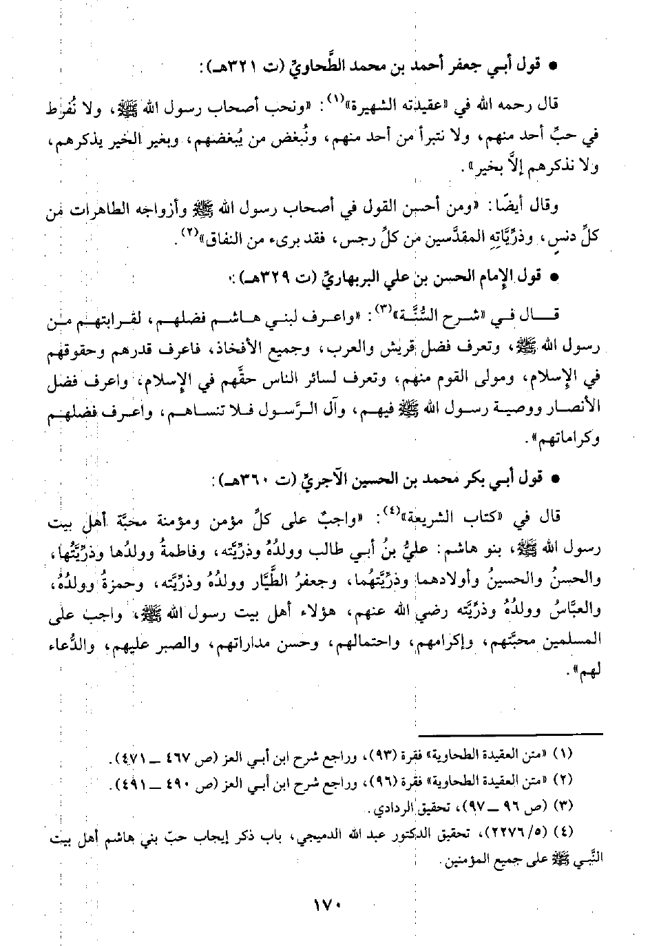 قال في "كتاب الشريعة" (¬٤): "واجبٌ على كلِّ مؤمن ومؤمنة محبَّه أهل بيت رسول الله -صلى الله عليه وسلم-، بنو هاشم: عليُّ بنُ أبي طالب وولدُهُ وذرِّيَّته، وفاطمةُ وولدُها وذرِّيَّتُها، والحسنُ والحسينُ وأولادهما وذرِّيَّتهُما، وجعفرُ الطَّيَّار وولدُهُ وذرِّيَّته، وحمزةُ وولدُهُ، والعبَّاسُ وولدُهُ وذرِّيَّته -رضي الله عنهم-، هؤلاء أهل بيت رسول الله -صلى الله عليه وسلم-، واجب على المسلمين محبَّتهم، وإكرامهم، واحتمالهم، وحسن مداراتهم، والصبر عليهم، والدُّعاء لهم".