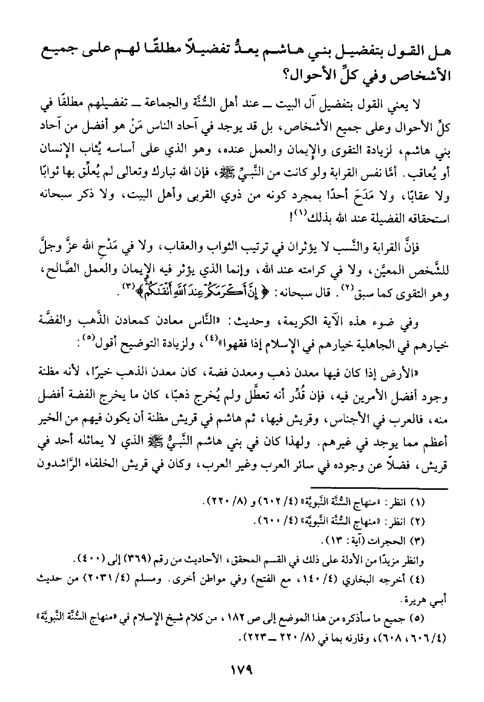 "الأرض إذا كان فيها معدن ذهب ومعدن فضة، كان معدن الذهب خيرًا، لأنه مظنة وجود أفضل الأمرين فيه، فإن قُدِّر أنه تعطَّل ولم يُخرج ذهبًا، كان ما يخرج الفضة أفضل منه، فالعرب في الأجناس، وقريش فيها، ثم هاشم في قريش مظنة أن يكون فيهم من الخير أعظم مما يوجد في غيرهم. ولهذا كان في بني هاشم النَّبيُّ -صلى الله عليه وسلم- الذي لا يماثله أحد في قريش، فضلًا عن وجوده في سائر العرب وغير العرب، وكان في قريش الخلفاء الرَّاشدون