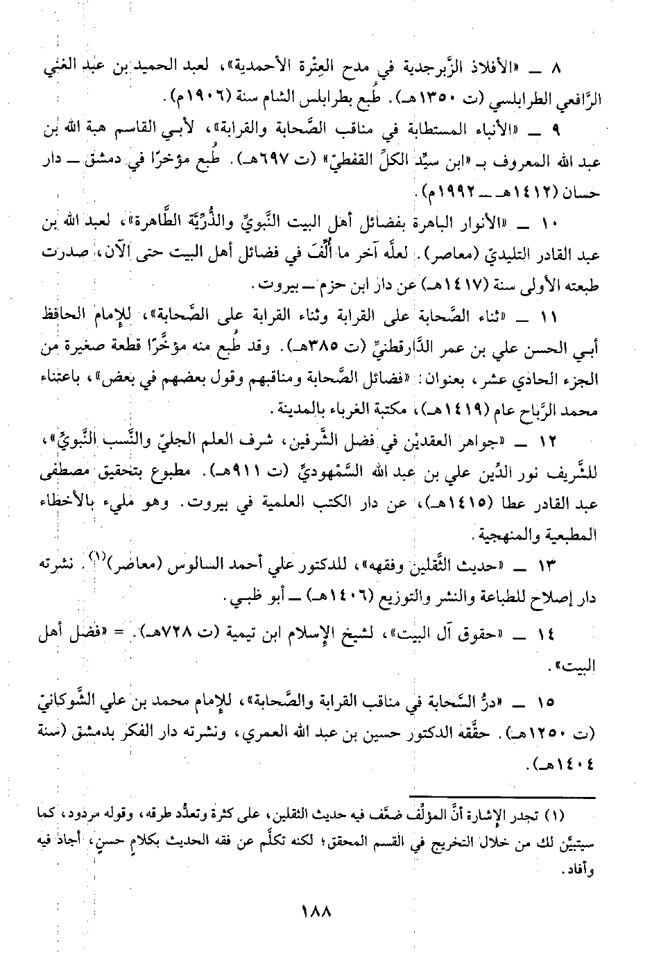 ١٥ - "درُّ السَّحابة في مناقب القرابة والصَّحابة"، للإمام محمد بن علي الشَّوكانيّ (ت ١٢٥٠ هـ). حقَّقه الدكتور حسين بن عبد الله العمري، ونشرته دار الفكر بدمشق (سنة ١٤٠٤ هـ).