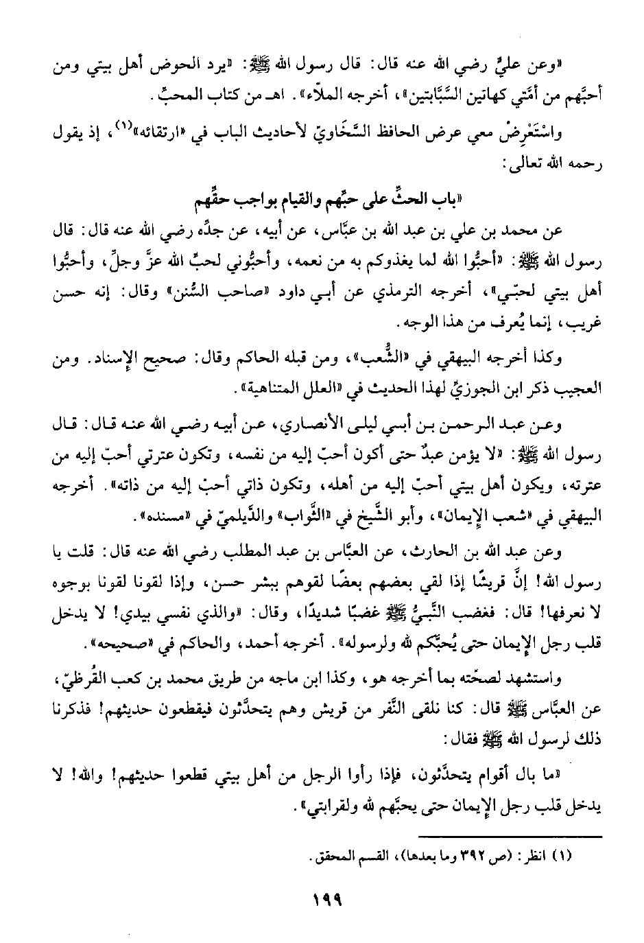 عن محمد بن علي بن عبد الله بن عبَّاس، عن أبيه، عن جدِّه رضي الله عنه قال: قال رسول الله -صلى الله عليه وسلم-: "أحبُّوا الله لما يغذوكم به من نعمه، وأحبُّوني لحبِّ الله عزَّ وجلِّ، وأحبُّوا أهل بيتي لحبّي"، أخرجه الترمذي عن أبي داود "صاحب السُّنن" وقال: إنه حسن غريب، إنما يُعرف من هذا الوجه.