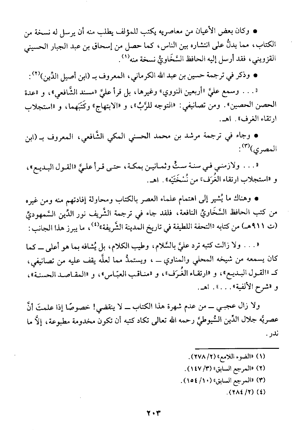 " ... ولا زالت كتبه ترد عليَّ بالسَّلام، وطيب الكلام، بل يُشافه بما هو أعلى -كما كان يسمعه من شيخه المحلي والمناوي-، ويستمدُّ مما لعلَّه يقف عليه من تصانيفي، كـ "القول البديع"، و "ارتقاء الغُرَف"، و"مناقب العبّاس"، و "المقاصد الحسنة"، و "شرح الألفية" ... ". اهـ