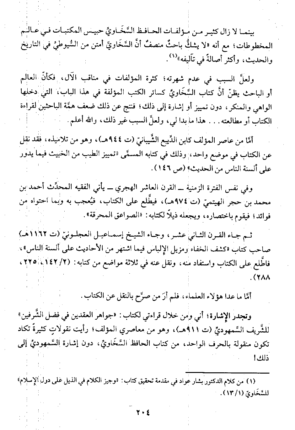بينما لا زال كثير من مؤلفات الحافظ السَّخَاويِّ حبيس المكتبات في عالم المخطوطات؛ مع أنه "لا يشكُّ باحثٌ منصفٌ أنَّ السَّخَاويَّ أمتن من السُّيوطيِّ في التاريخ والحديث، وأكثر أصالةً في تآليفه" (¬١).