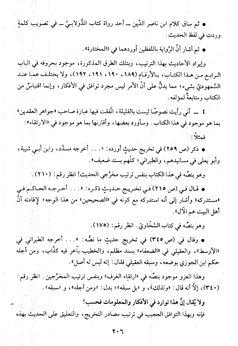 ٤ - أني رأيت نصوصًا ليست بالقليلة، اتَّفقت فيها عبارة صاحب "جواهر العقدين" بما هو موجود في هذا الكتاب. وسأورد بعضها، وأقارنها بما هو موجود في "الارتقاء": فمثلًا: