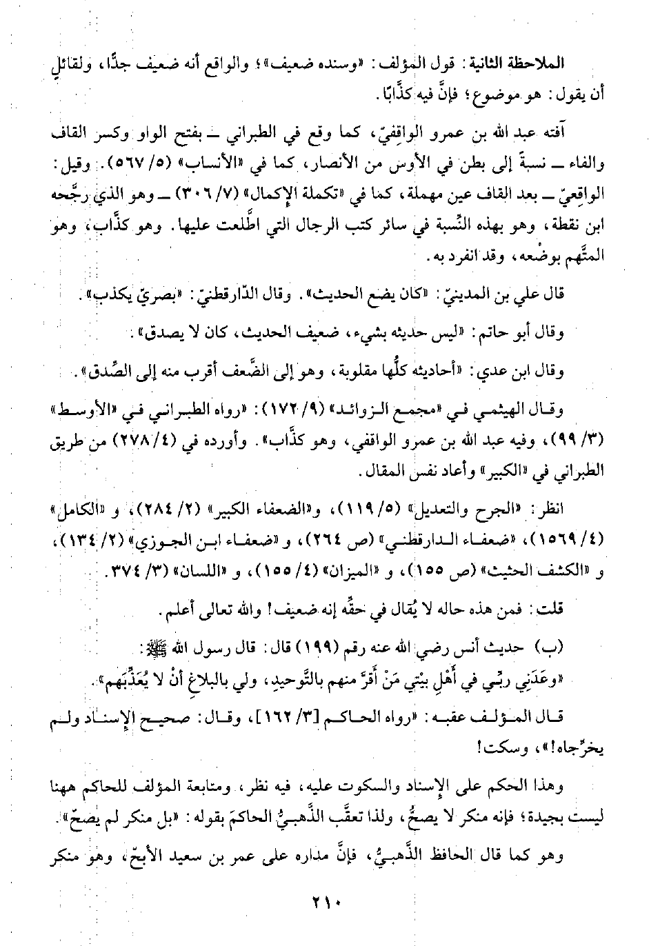 وقال الهيثمي في "مجمع الزوائد" (٩/ ١٧٢): "رواه الطبراني في "الأوسط" (٣/ ٩٩)، وفيه عبد الله بن عمرو الواقفي، وهو كذَّاب". وأورده في (٤/ ٢٧٨) من طريق الطبراني في "الكبير" وأعاد نفس المقال.