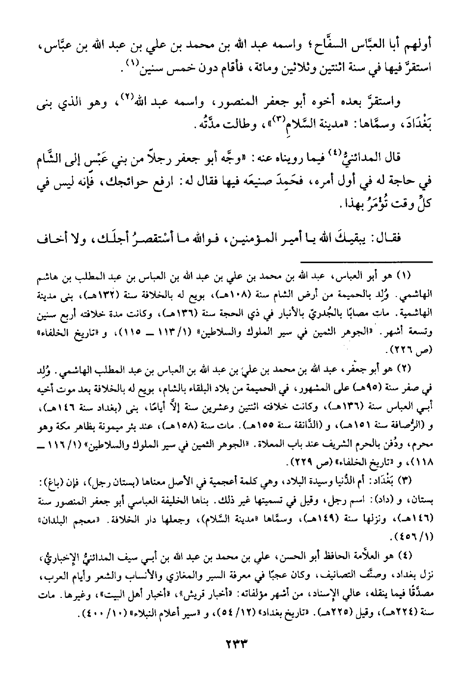 (¬٢) هو أبو جعفر، عبد الله بن محمد بن علي بن عبد الله بن العباس بن عبد المطلب الهاشمي. وُلِد في صفر سنة (٩٥ هـ) على المشهور، في الحميمة من بلاد البلقاء بالشام، بويع له بالخلافة بعد موت أخيه أبي العباس سنة (١٣٦ هـ)، وكانت خلافته اثنتين وعشرين سنة إلَّا أيامًا، بنى (بغداد سنة ١٤٦ هـ)، و (الرُّصافة سنة ١٥١ هـ)، و (الدَّانقة سنة ١٥٥ هـ). مات سنة (١٥٨ هـ)، عند بئر ميمونة بظاهر مكة وهو محرم، ودُفن بالحرم الشريف عند باب المعلاة. "الجوهر الثمين في سير الملوك والسلاطين" (١/ ١١٦ - ١١٨)، و "تاريخ الخلفاء" (ص ٢٢٩).