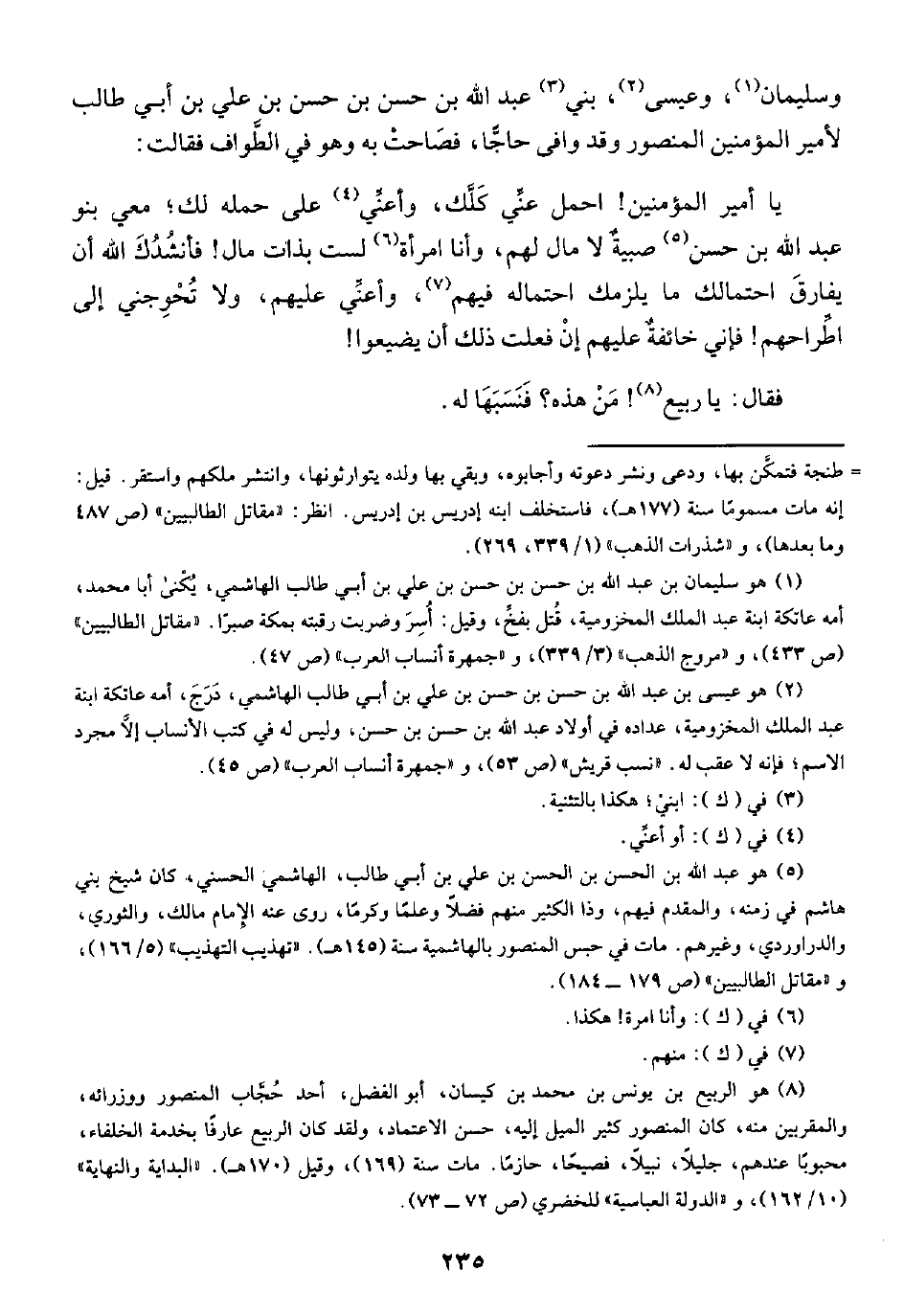 (¬٥) هو عبد الله بن الحسن بن الحسن بن علي بن أبي طالب، الهاشمي الحسني، كان شيخ بني هاشم في زمنه، والمقدم فيهم، وذا الكثير منهم فضلًا وعلمًا وكرمًا، روى منه الإِمام مالك، والثوري، والدراوردي، وغيرهم. مات في حبس المنصور بالهاشمية سنة (١٤٥ هـ). "تهذب التهذيب" (٥/ ١٦٦)، و "مقاتل الطالبين" (ص ١٧٩ - ١٨٤).