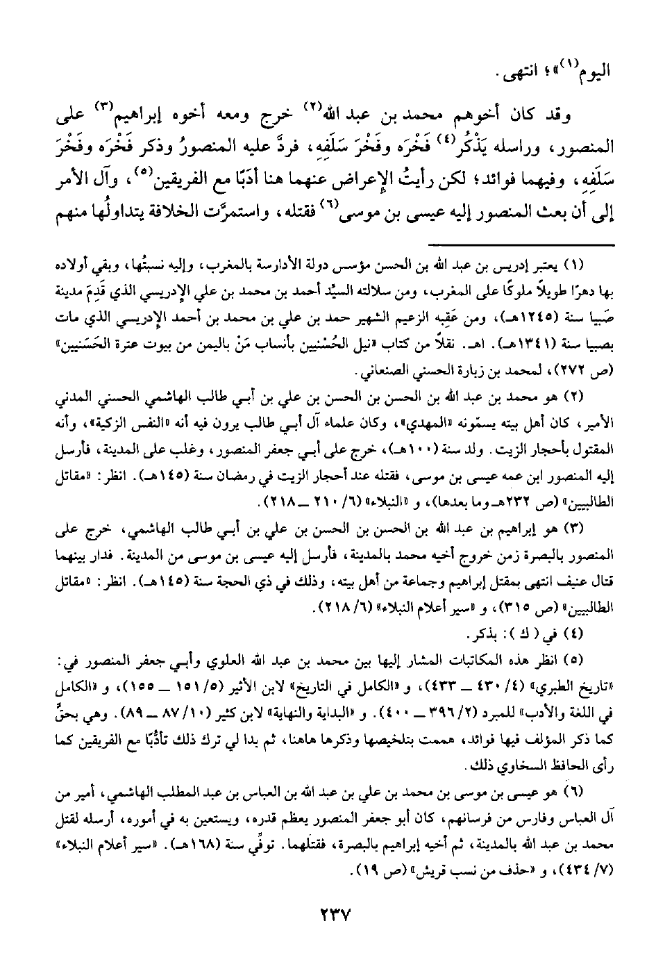 وقد كان أخوهم محمد بن عبد الله (¬٢) خرج ومعه أخوه إبراهيم (¬٣) على المنصور، وراسله يَذْكُر (¬٤) فَخْرَه وفَخْرَ سَلَفِهِ، فردَّ عليه المنصورُ وذكر فَخْرَه وفَخْرَ سَلَفِهِ، وفيهما فوائد؛ لكن رأيتُ الإِعراض عنهما هنا أدَبّا مع الفريقين (¬٥)، وآل الأمر إلى أنَّ بعث المنصور إليه عيسى بن موسى (¬٦) فقتله، واستمرَّت الخلافة يتداولُها منهم