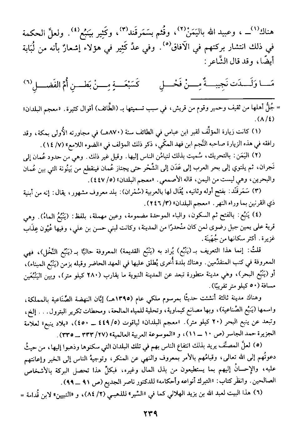 (¬٤) يَنبُع: بالفتح ثم السكون، والباء الموحدة مضمومة، وعين مهملة، بلفظ: (يَنْبُعُ الماءُ). وهي قرية على يمين جبل رضوى لمن كان منحدرًا من المدينة، وكانت لبني حسن بن علي، وفيها عُيُون عِذَاب غزيرة. أكثر سكانها من جُهَينَة.