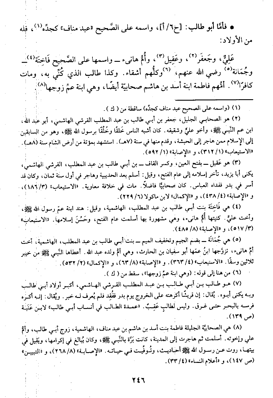 • فأمَّا أبو طالب: , واسمه على الصَّحيح "عبد مناف" كجدِّه (¬١)، فله من الأولاد: عَلِيٌّ، وجَعفَر (¬٢)، عَقِيل (¬٣)، وأُمُّ هانئ -واسمها على الصَّحيح فَاخِتَة (¬٤) - وجُمَانة (¬٥) رضي الله عنهم، (¬٦) وكلُّهم أشقاء. وكذا طالب الذي كُنِّي به، ومات كافرًا (¬٧). أمُّهم فاطمة ابنة أسد بن هاشم صحابيّة أيضًا، وهي ابنة عمِّ زوجها (¬٨).