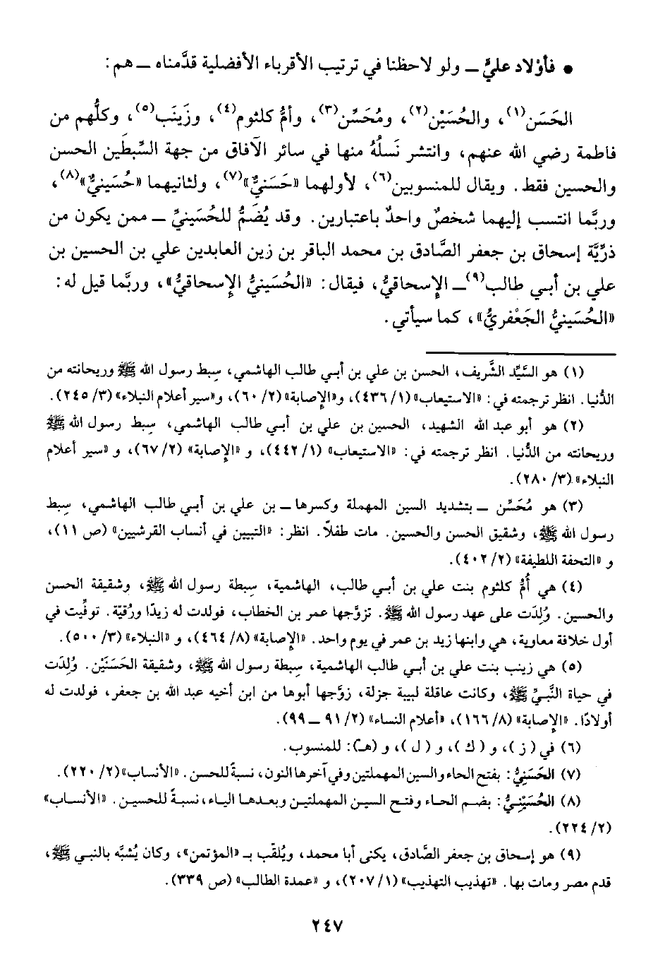 الحَسَن (¬١)، والحُسَيْن (¬٢)، ومُحَسِّن (¬٣)، وأمُّ كلثوم (¬٤)، وزَينَب (¬٥)، وكلُّهم من فاطمة رضي الله عنهم، وانتشر نَسلُهُ منها في سائر الآفاق من جهة السِّبطَين الحسن والحسين فقط. ويقال للمنسوبين (¬٦)، لأولهما "حَسَنيٌّ" (¬٧)، ولثانيهما "حُسَينيٌّ" (¬٨)، وربَّما انتسب إليهما شخصٌ واحدٌ باعتبارين. وقد يُضَمُّ للحُسَينيِّ -ممن يكون من ذرِّيَّهَ إسحاق بن جعفر الصَّادق بن محمد الباقر بن زين العابدين علي بن الحسين بن علي بن أبي طالب (¬٩) - الإِسحاقيُّ، فيقال: "الحُسَينيُّ الإسحاقيُّ"، وربَّما قيل له: "الحُسَيني الجَعْفريُّ"، كما سيأتي.