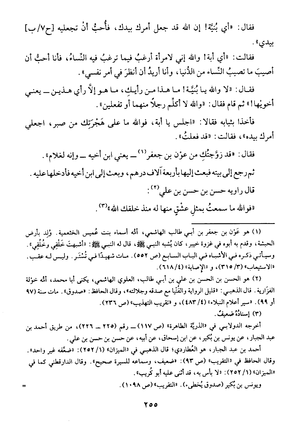 أخرجه الدولابي في "الذريَّة الطاهرة" (ص ١١٧) - رقم (٢٢٥ - ٢٢٦)، من طريق أحمد بن عبد الجبار، عن يونس بن بُكير، عن ابن إسحاق، عن أبيه، عن حسن بن حسن بن علي.