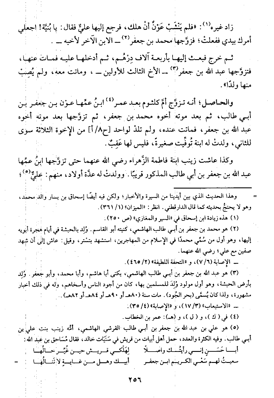 والحاصل؛ أنه تزوَّج أمَّ كلثوم بعد عمر (¬٤) ابنُ عمِّها عوْن بن جعفر بن أبي طالب، ثم بعد موته أخوه محمد بن جعفر، ثم تزوَّجها بعد موته أخوه عبد الله بن جعفر، فماتت عنده، ولم تلدْ لواحد من الإخوة الثلاثة سوى للثاني، ولدتْ له ابنة تُوفِّيت صغيرةً، فليس لها عَقِبٌ.