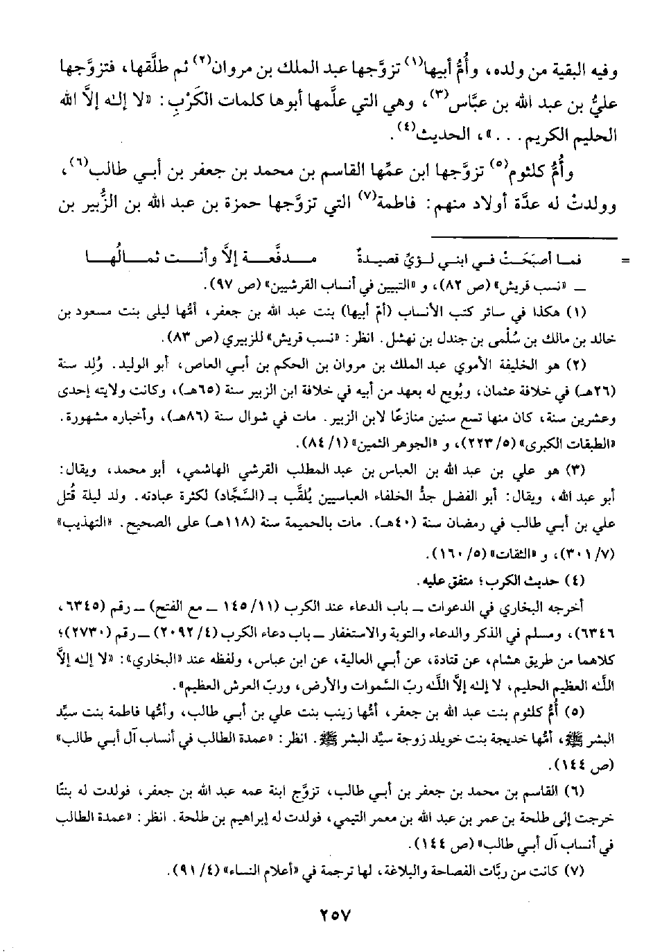 وفيه البقية من ولده، وأُمُّ أبيها (¬١) تزوَّجها عبد الملك بن مروان (¬٢) ثم طلَّقها، فتزوَّجها عليُّ بن عبد الله بن عبَّاس (¬٣)، وهي التي علَّمها أبوها كلمات الكَرْبِ: "لا إله إلَّا الله الحليم الكريم ... "، الحديث (¬٤).