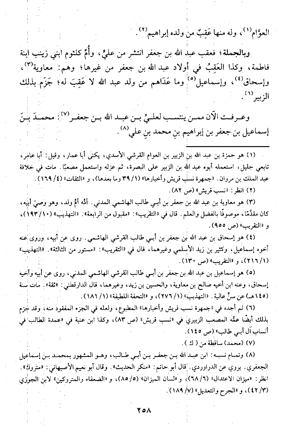 وبالجملة؛ فعقب عبد الله بن جعفر انتشر من عليٍّ، وأُمِّ كلثوم ابني زينب ابنة فاطمة، وكذا العَقِبُ في أولاد عبد الله بن جعفر من غيرها؛ وهم: معاوية (¬٣)، وإسحاق (¬٤)، وإسماعيل (¬٥) وما عَدَاهم من ولد عبد الله لا عَقِبَ له؛ جَزَم بذلك الزبير (¬٦).