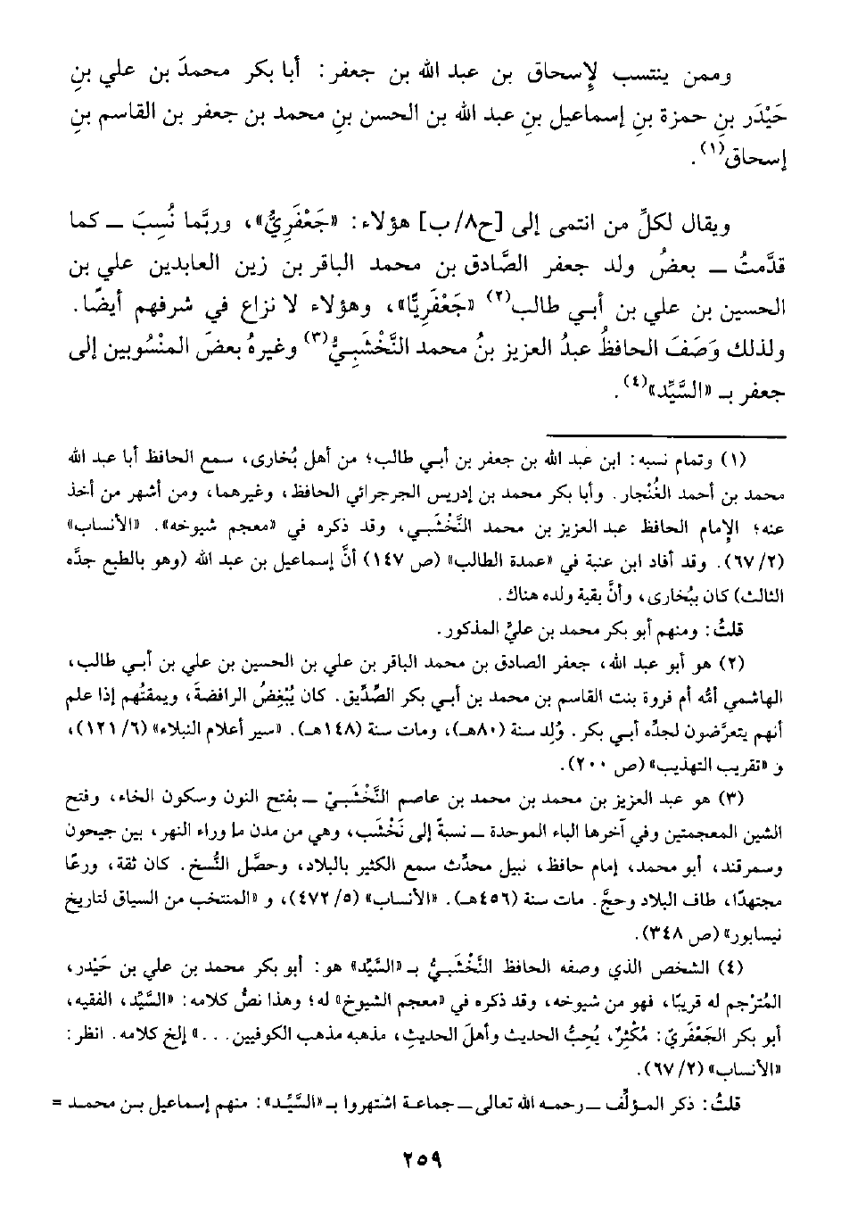 ويقال لكلِّ من انتمى إلى [ح ٨/ ب] هؤلاء: "جَعْفَرِيُّ"، وربَّما نُسِبَ -كما قدَّمتُ- بعضُ ولد جعفر الصَّادق بن محمد الباقر بن زين العابدين علي بن الحسين بن علي بن أبي طالب (¬٢) "جَعْفَرِيًّا"، وهؤلاء لا نزاع في شرفهم أيضًا. ولذلك وَصَفَ الحافظُ عبدُ العزيز بنُ محمد النَّخْشَبِيُّ (¬٣) وغيرهُ بعضَ المنْسُوبين إلى جعفر بـ "السَّيِّد" (¬٤).