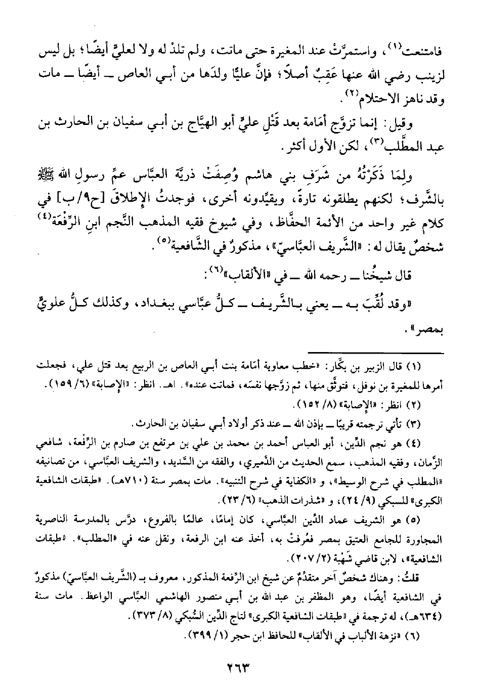 ولِمَا ذَكَرْتُهُ من شَرَفِ بني هاشم وُصِفَتْ ذريّهَ العبَّاس عمِّ رسولِ الله -صلى الله عليه وسلم- بالشَّرف؛ لكنهم يطلقونه تارةً، ويقيِّدونه أخرى، فوجدتُ الإِطلاقَ [ح ٩ / ب] في كلام غير واحد من الأئمة الحفَّاظ، وفي شيوخ فقيه المذهب النَّجم ابنِ الرِّفْعَة (¬٤) شخصٌ يقال له: "الشَّريف العبَّاسيّ"، مذكورٌ في الشَّافعية (¬٥).