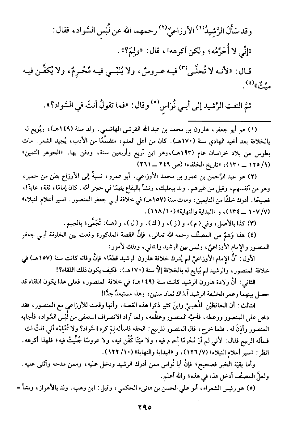 الثالث: أن الحافظيْن الذَّهبيَّ وابنَ كثير ذكرا هذه القصة، وأنها وقعت للأوزاعي مع المنصور، فقد دخل على المنصور ووعظه، فأحبَّه المنصور وعظَّمه، ولما أراد الإنصراف استعفى من لُبْس السَّواد، فأجابه المنصور وأذِنَ له. فلما خرج، قال المنصور للربيع: الحقه فاسأله لِمَ كره السَّواد؟ ولا تُعْلِمْه أني قلتُ لك. فسأله الربيع فقال: لأني لم أرَ مُحْرمًا أحرم فيه، ولا ميِّتًا كُفِّن فيه، ولا عروسًا جُلِّيتْ فيه؛ فلهذا أكرهه. انظر: "سير أعلام النبلاء" (٧/ ١٢٦)، و"البداية والنهاية" (١٠/ ١٢٢).