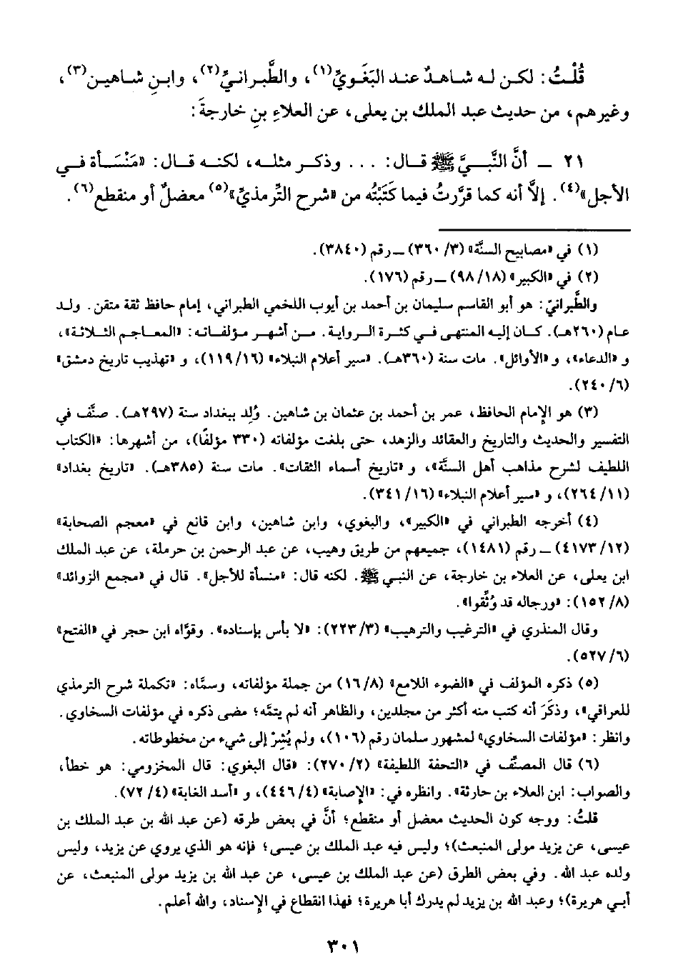 ٢١ - أن النَّبيَّ -صلى الله عليه وسلم- قال: ... وذكر مثله، لكنه قال: "مَنْسَأة في الأجل" (¬٤). إلا أنه كما قرَّرتُ فيما كَتَبْتُه من "شرح التِّرمذيِّ" (¬٥) معضلٌ أو منقطع (¬٦).