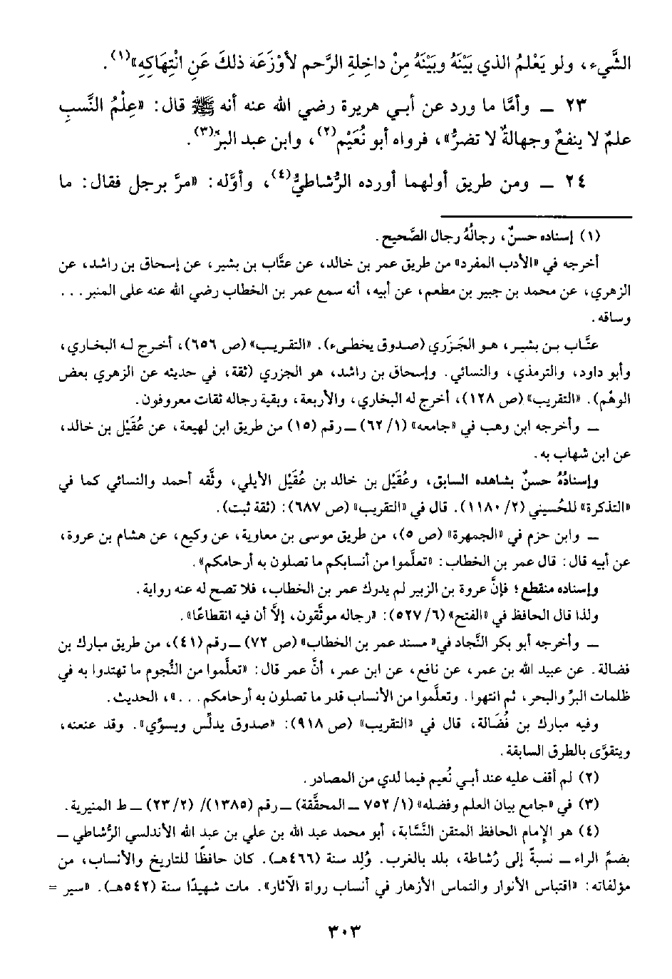 ٢٣ - وأمَّا ما ورد عن أبي هريرة رضي الله عنه أنه -صلى الله عليه وسلم- قال: "عِلْمُ النَّسبِ علمٌ لا ينفع وجهالةٌ لا تضرُّ"، فرواه أبو نُعَيْم (¬٢)، وابن عبد البرِّ (¬٣).